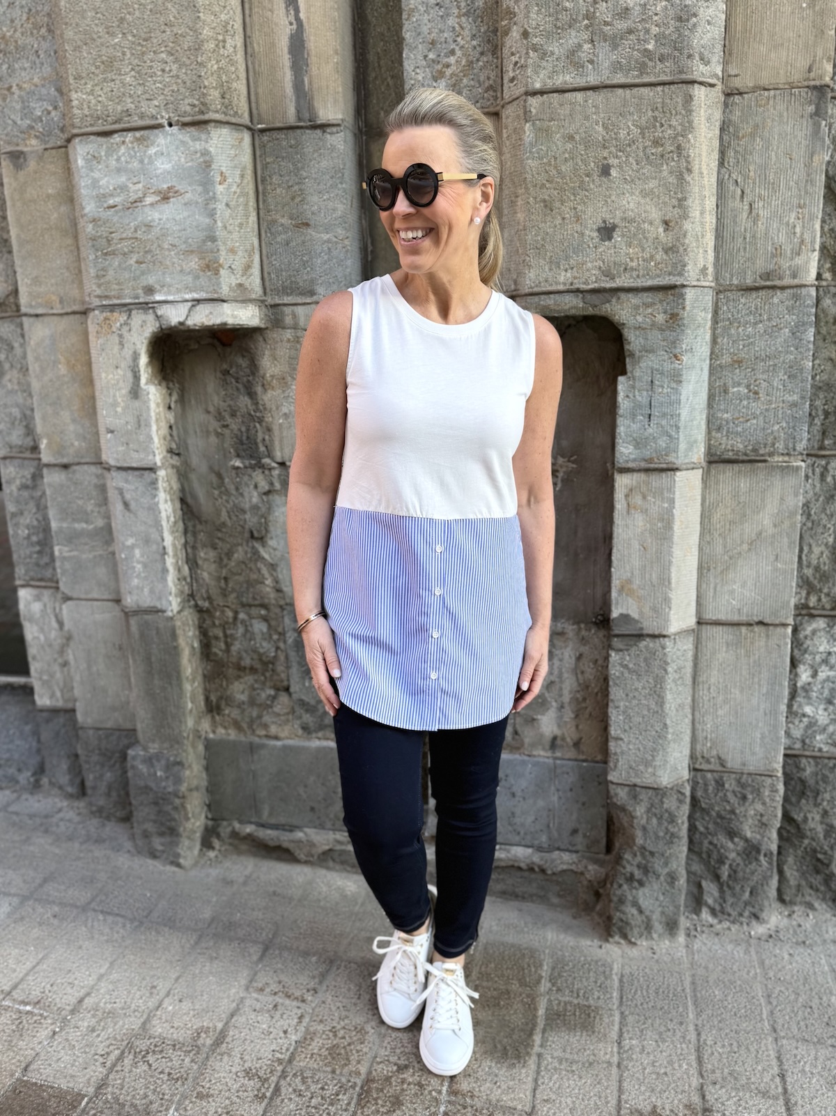 Delphina on pidempi toppi, joka tulee reippaasti pepun alapuolelle. Topin ideana on pukea se lyhkäisempien yläosien alle häivyttäen lantiota ja peppua. Topissa on t-paita yläosa, joka hieman joustaa. Alaosa on kangasta, joka ei jousta. Alaosan edessä on napit, jotka voi avata. Katalla on topista päällä koko S. Toppi venyy yläosasta noin 6-8 cm alla oleviin mittoihin. Suosittelemme ottamaan topista oman koon tai yhden pienemmän, jos oma vartalon mitta on kokojen välissä.