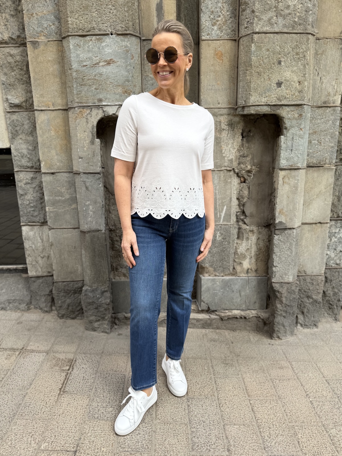 Edla on kaunis t-paita. Kaula-aukko on O-mallinen ja hihat loistavan mittaiset. Malliltaan t-paita on suora ja se loppuu lonkkaluiden alapuolelle. T-paidan helmassa on kaunis kirjailu, joka on sävy sävyyn t-paidan kanssa. Katalla on t-paidasta päällä koko 34. T-paita vastaa normaalia kokoa.