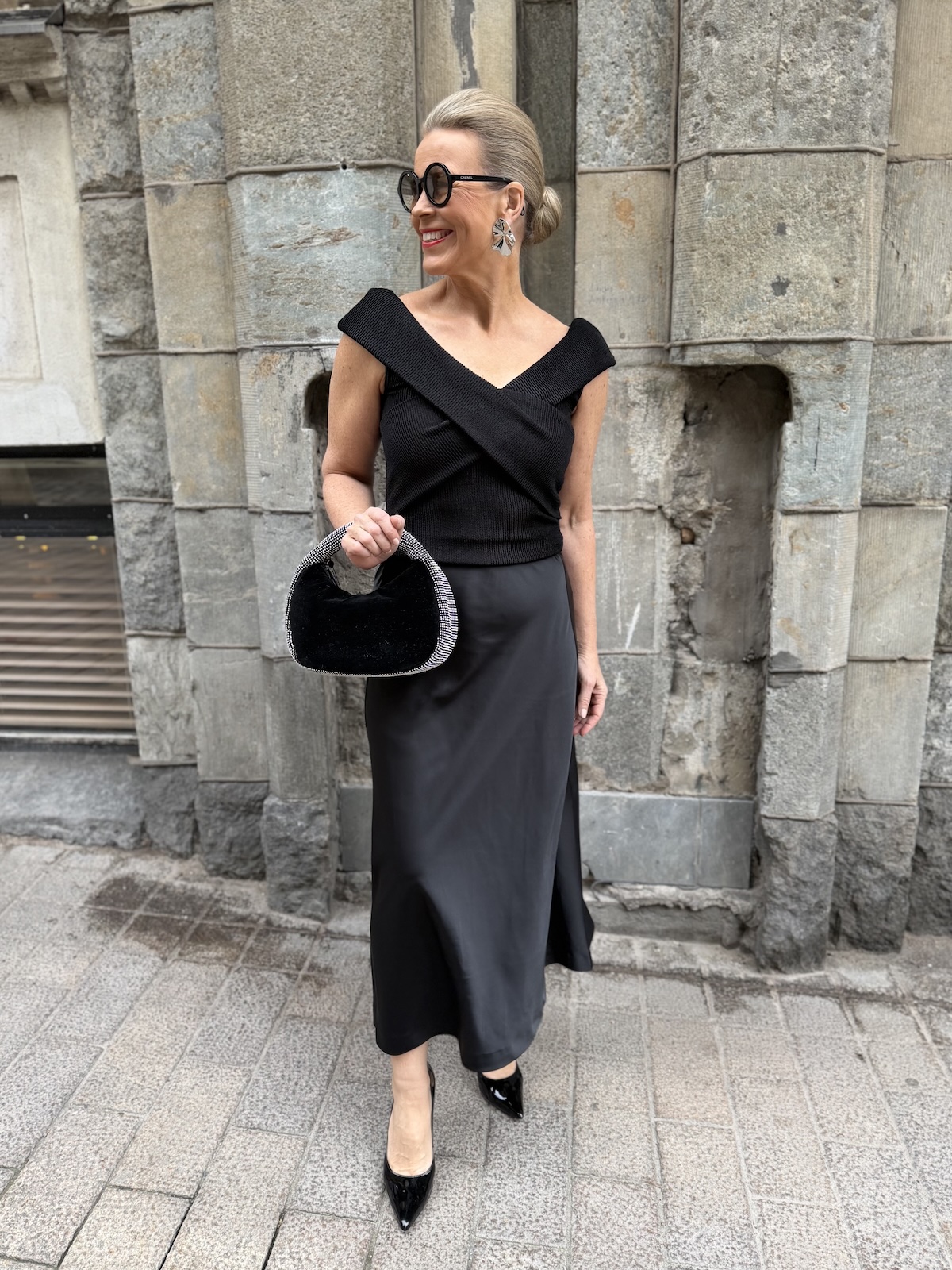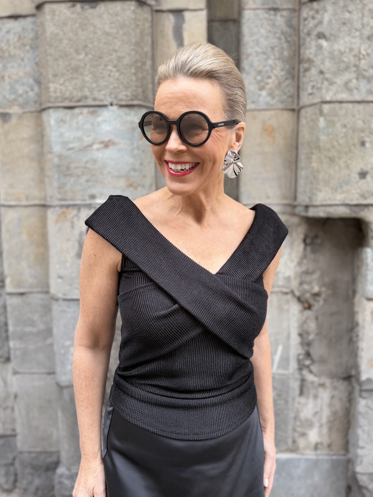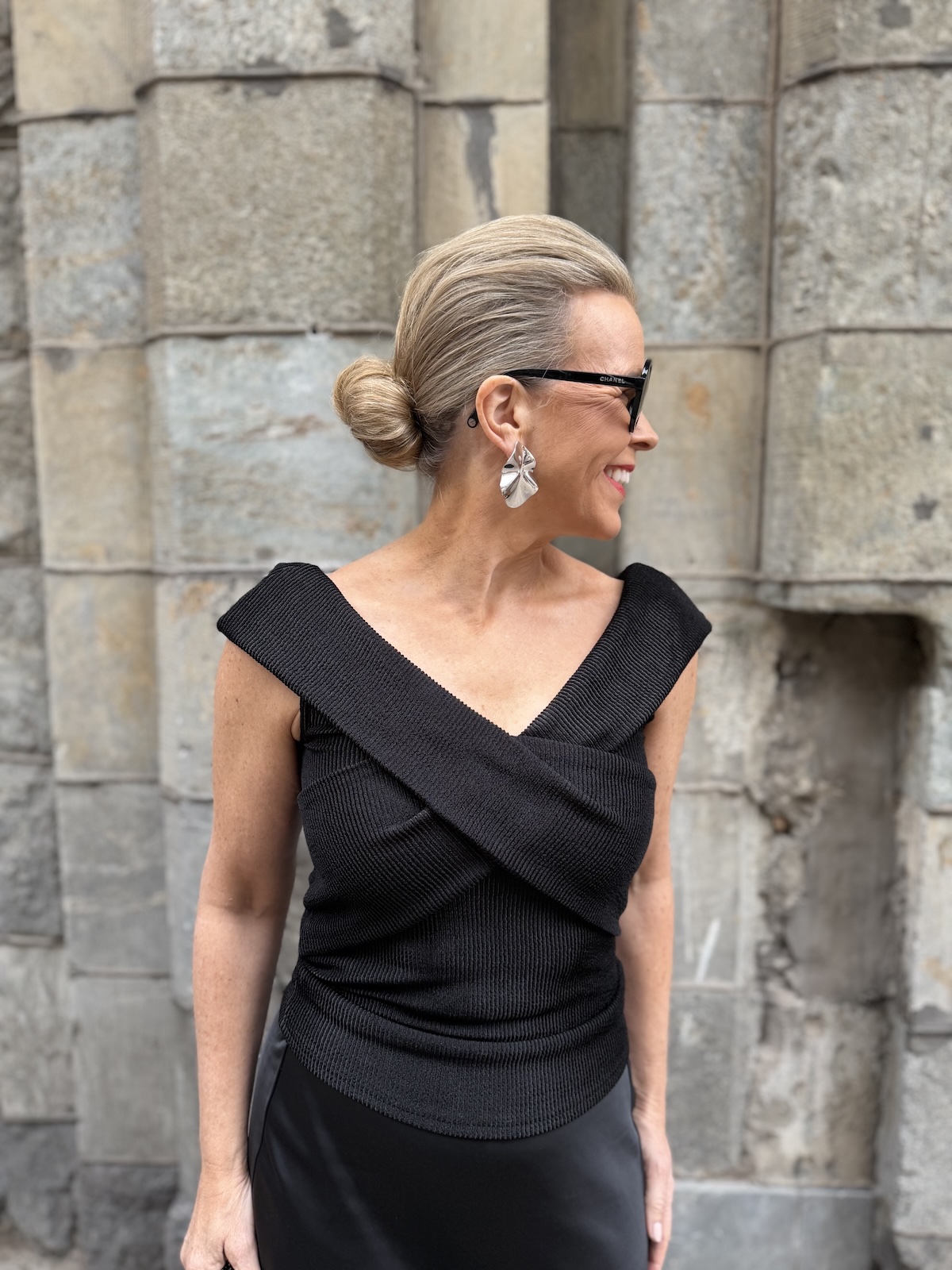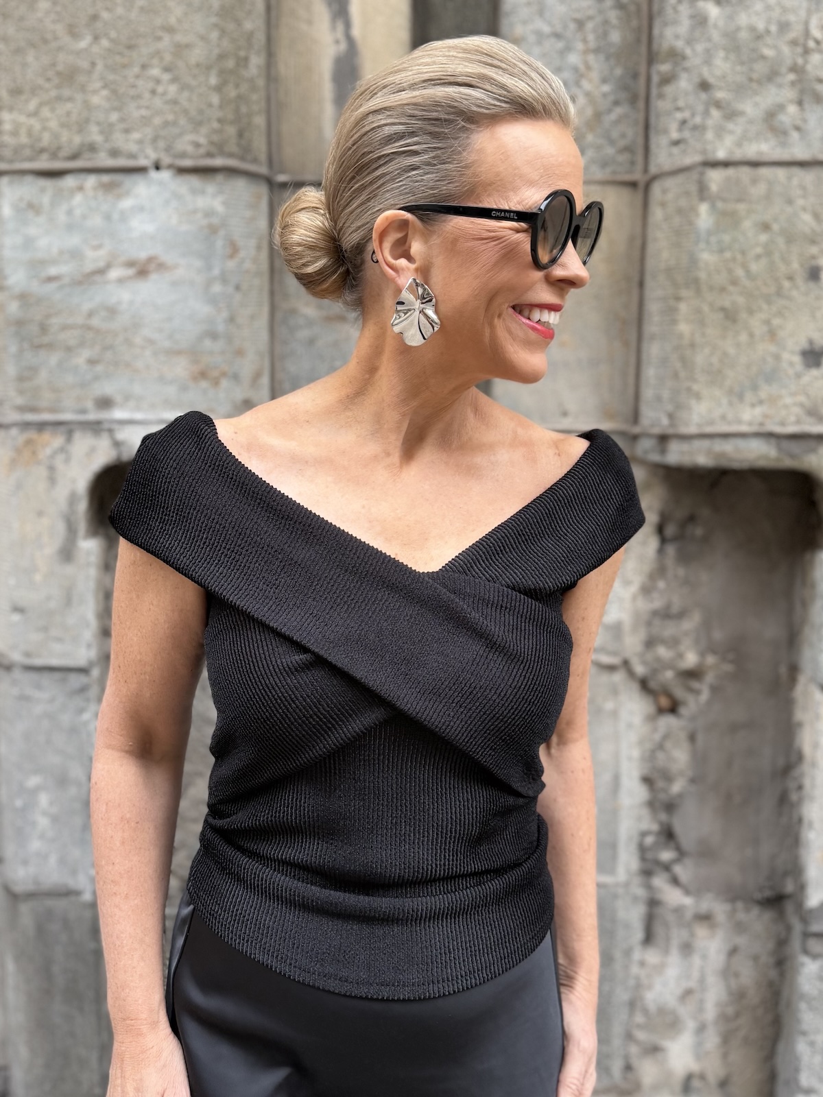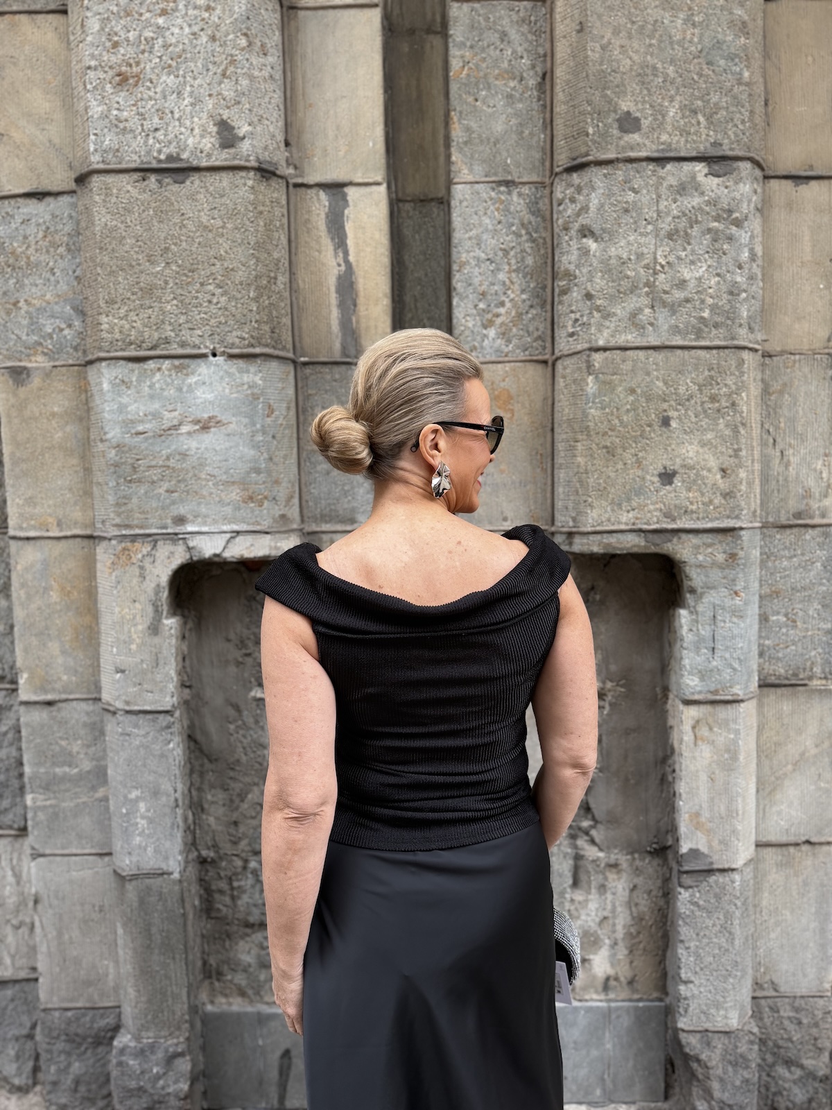 Elspeth toppi on kaunis ja elegantti toppi ja myös ns. ikuisuustoppi eli se toimii aina. Topissa on laaja kaula-aukko eli olkaimia voi vetäistä alas olkapäille. Malliltaan toppi on vartalonmyötäinen ja se on myös joustavaa kangasta. Toppi ylettyy noin lonkkaluiden päälle. Katalla on topista päällä koko S.