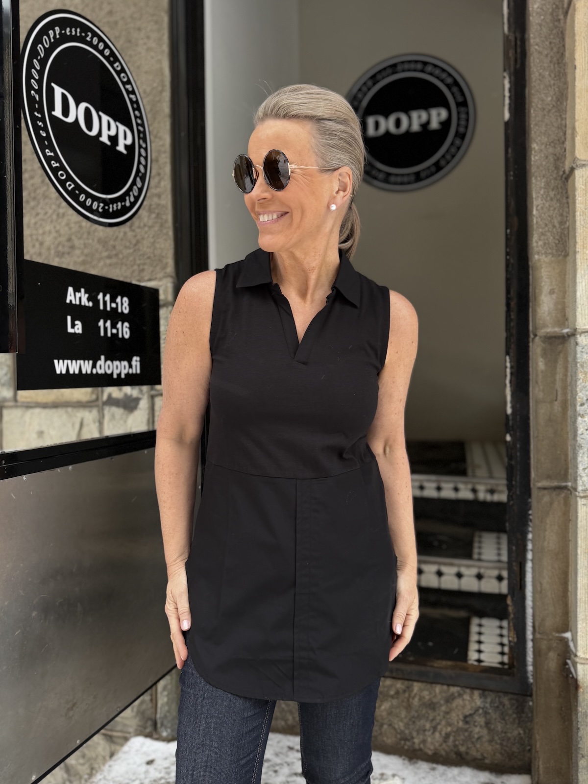 Delphina on pidempi toppi kauluksilla ja V-aukolla edessä, joka tulee reippaasti pepun alapuolelle. Topin ideana on pukea se lyhkäisempien yläosien alle häivyttäen lantiota ja peppua. Topissa on t-paita yläosa, joka hieman joustaa. Alaosa on kangasta, joka ei jousta. Katalla on topista päällä koko XS. Toppi venyy yläosasta noin 6-8 cm alla oleviin mittoihin. Suosittelemme ottamaan topista oman koon tai yhden pienemmän, jos oma vartalon mitta on kokojen välissä.