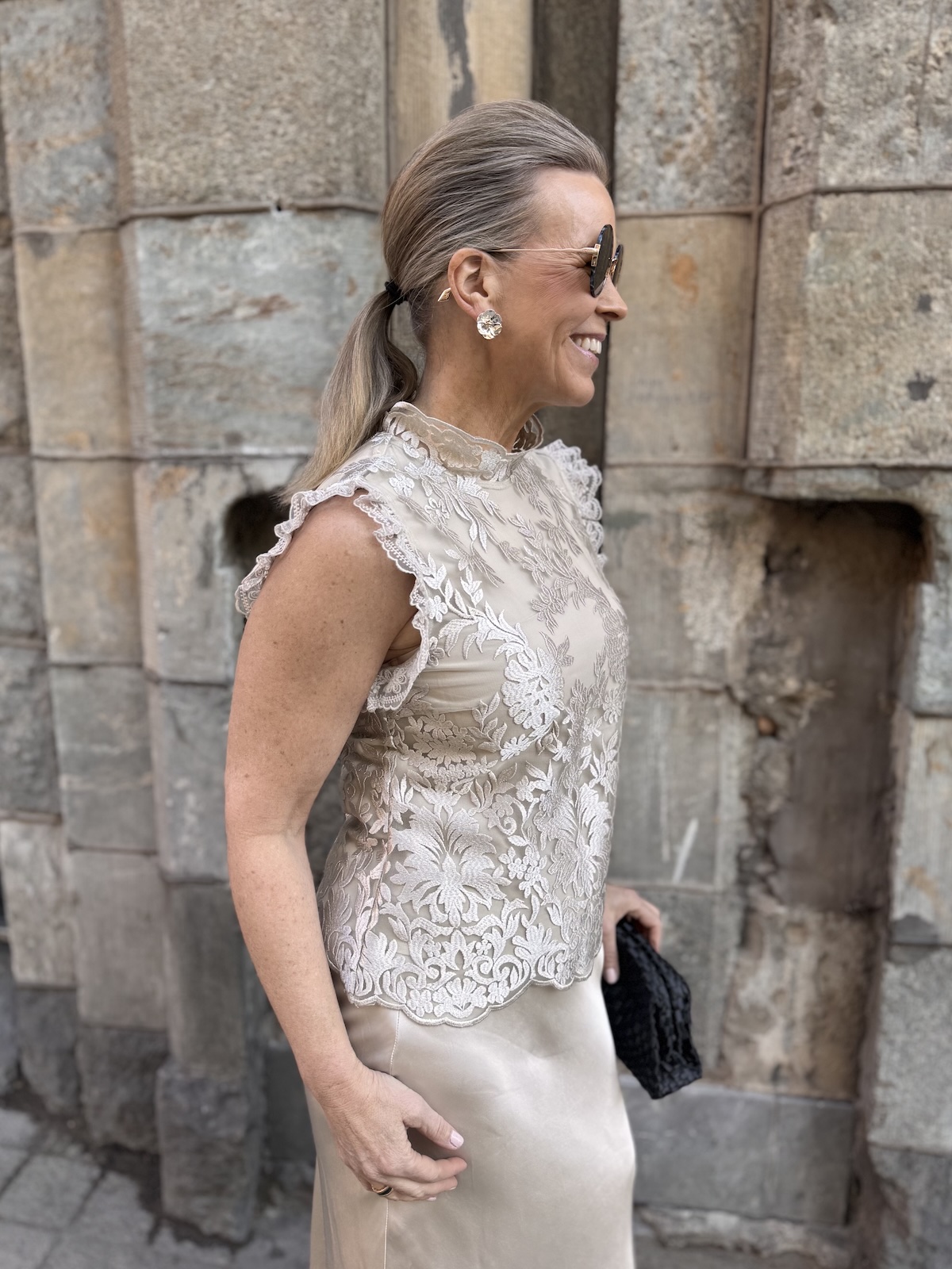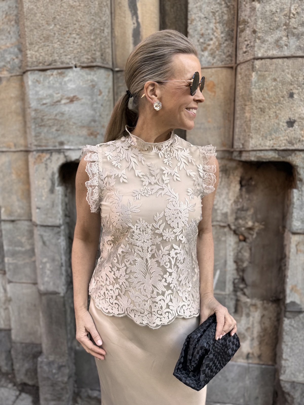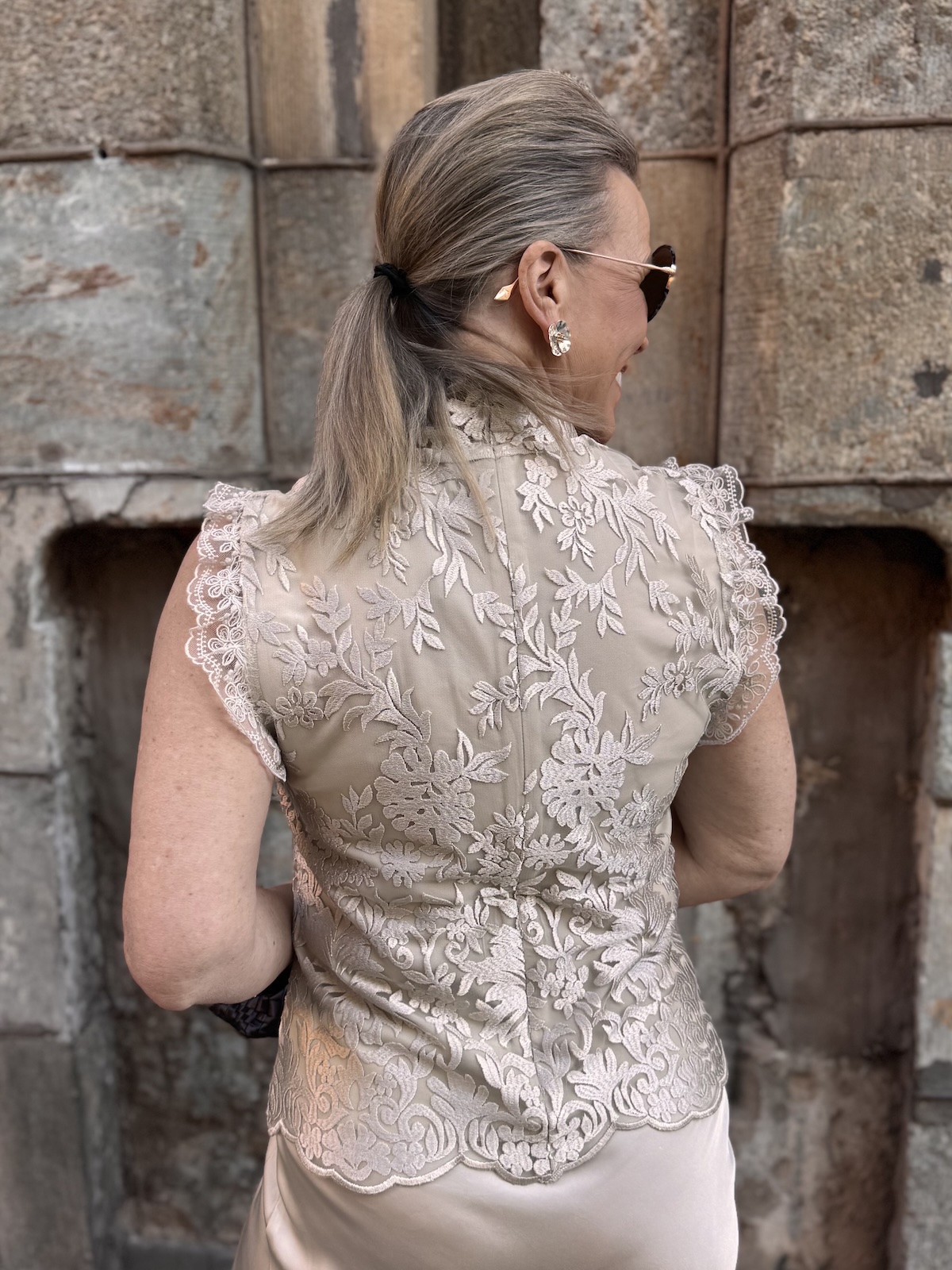 Tämä on upea pitsitoppi! Topissa on kaunis pitsikangas ja vuorikangas on sävysävyyn ja se joustaa. Topissa on pystykaulus ja hihasuissa on kauniit pitsikantit. Toppi ylettyy lantiolle ja on aavituksen löysähkö vyötärön kohdasta, mikä tekeekin siitä tyylikkään. Selkäpuolella on pitkä vetoketju. Katalla on topista päällä koko 36. Toppi on yhden koon pienempää kokoa kuin normaalisti.