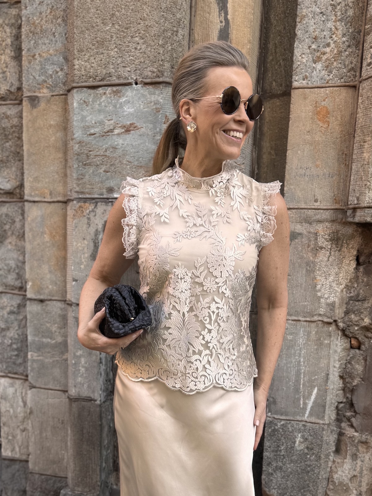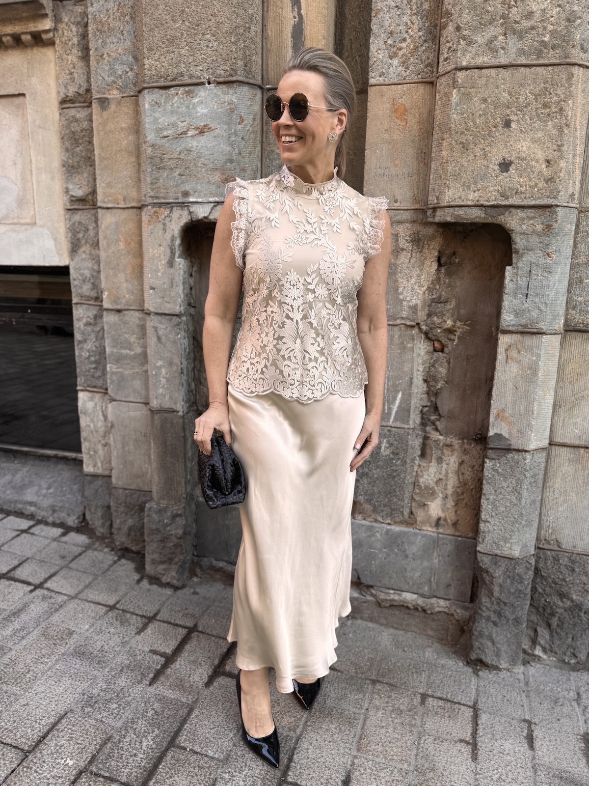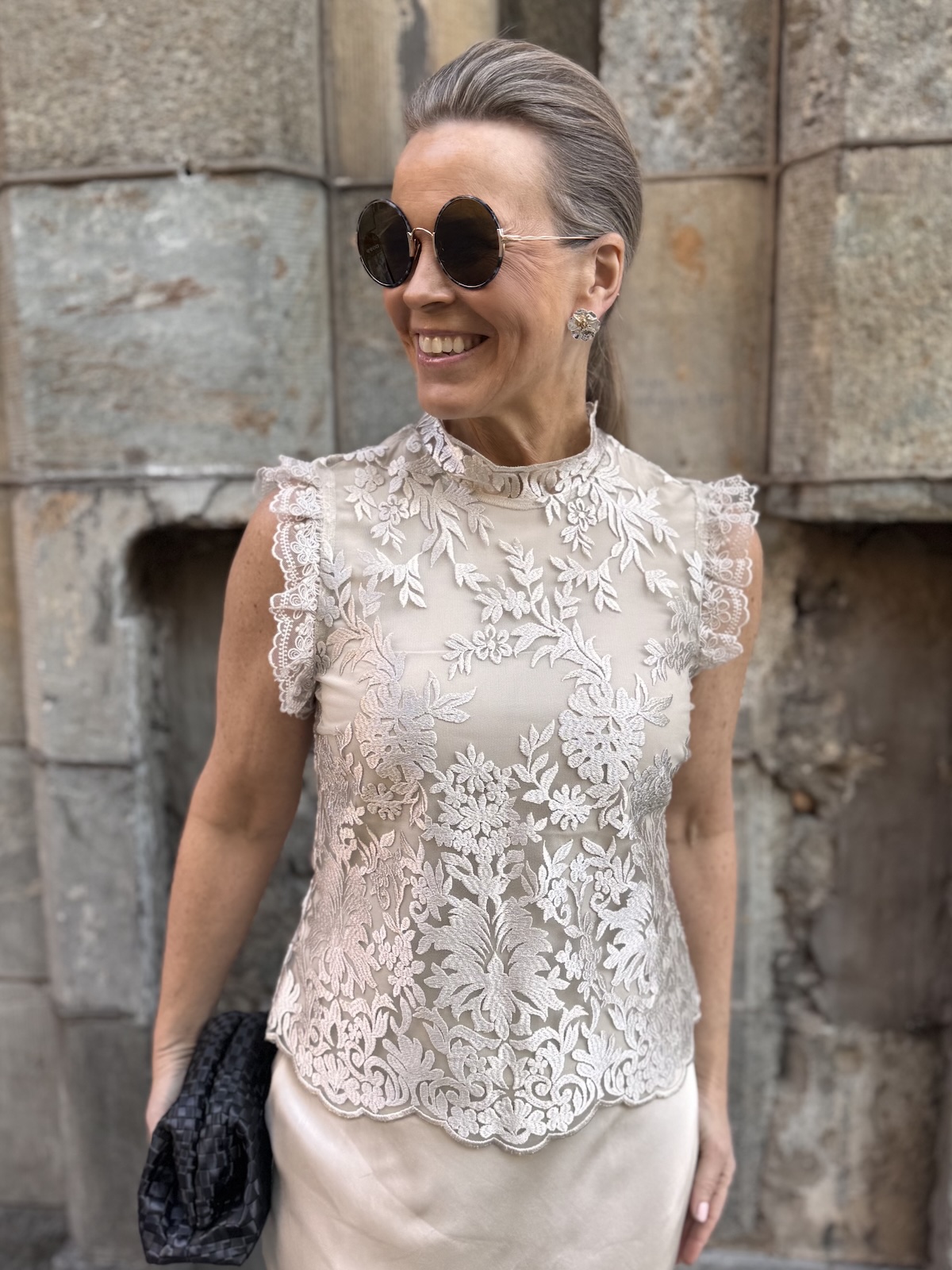Tämä on upea pitsitoppi! Topissa on kaunis pitsikangas ja vuorikangas on sävysävyyn ja se joustaa. Topissa on pystykaulus ja hihasuissa on kauniit pitsikantit. Toppi ylettyy lantiolle ja on aavituksen löysähkö vyötärön kohdasta, mikä tekeekin siitä tyylikkään. Selkäpuolella on pitkä vetoketju. Katalla on topista päällä koko 36. Toppi on yhden koon pienempää kokoa kuin normaalisti.