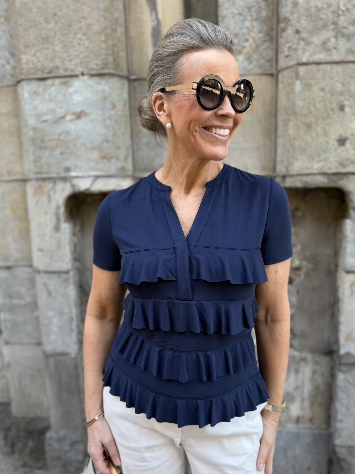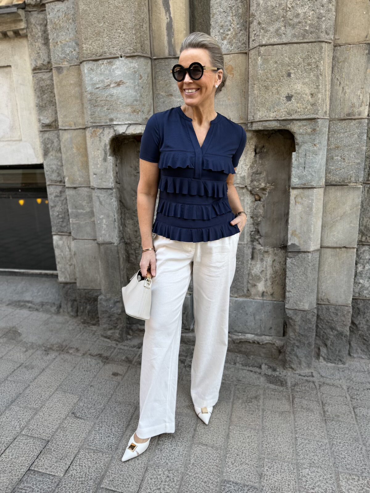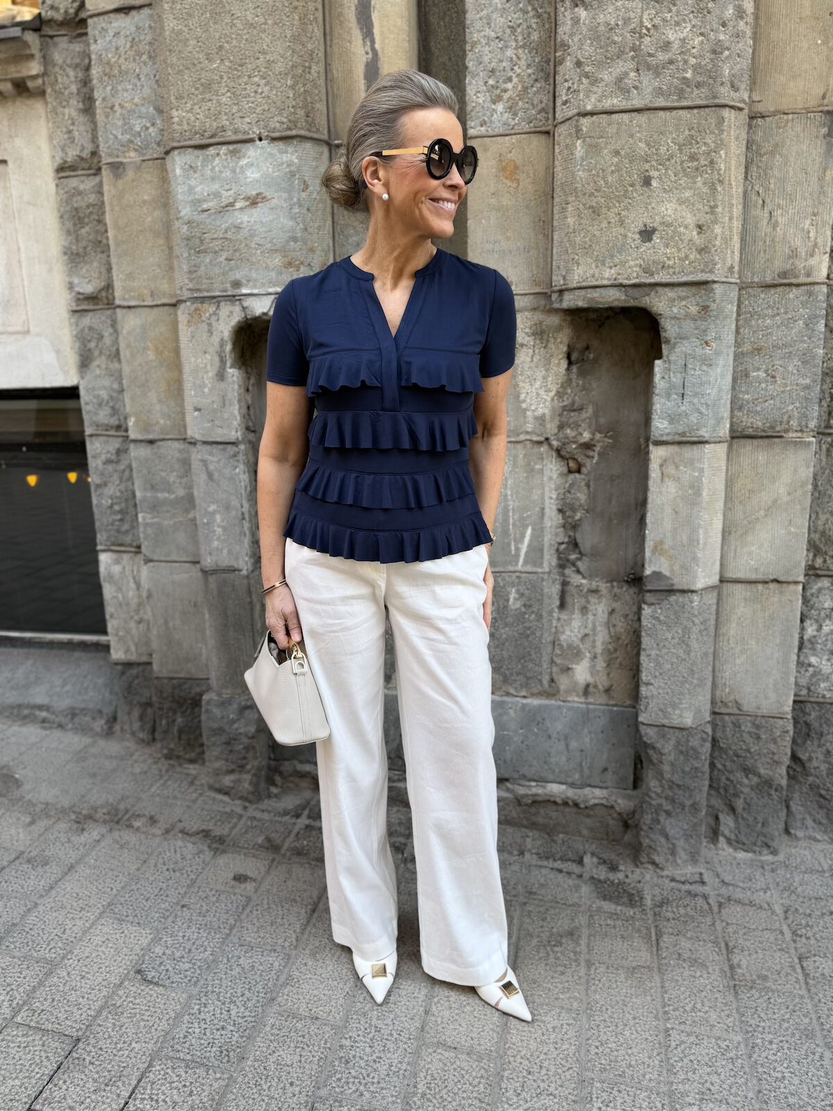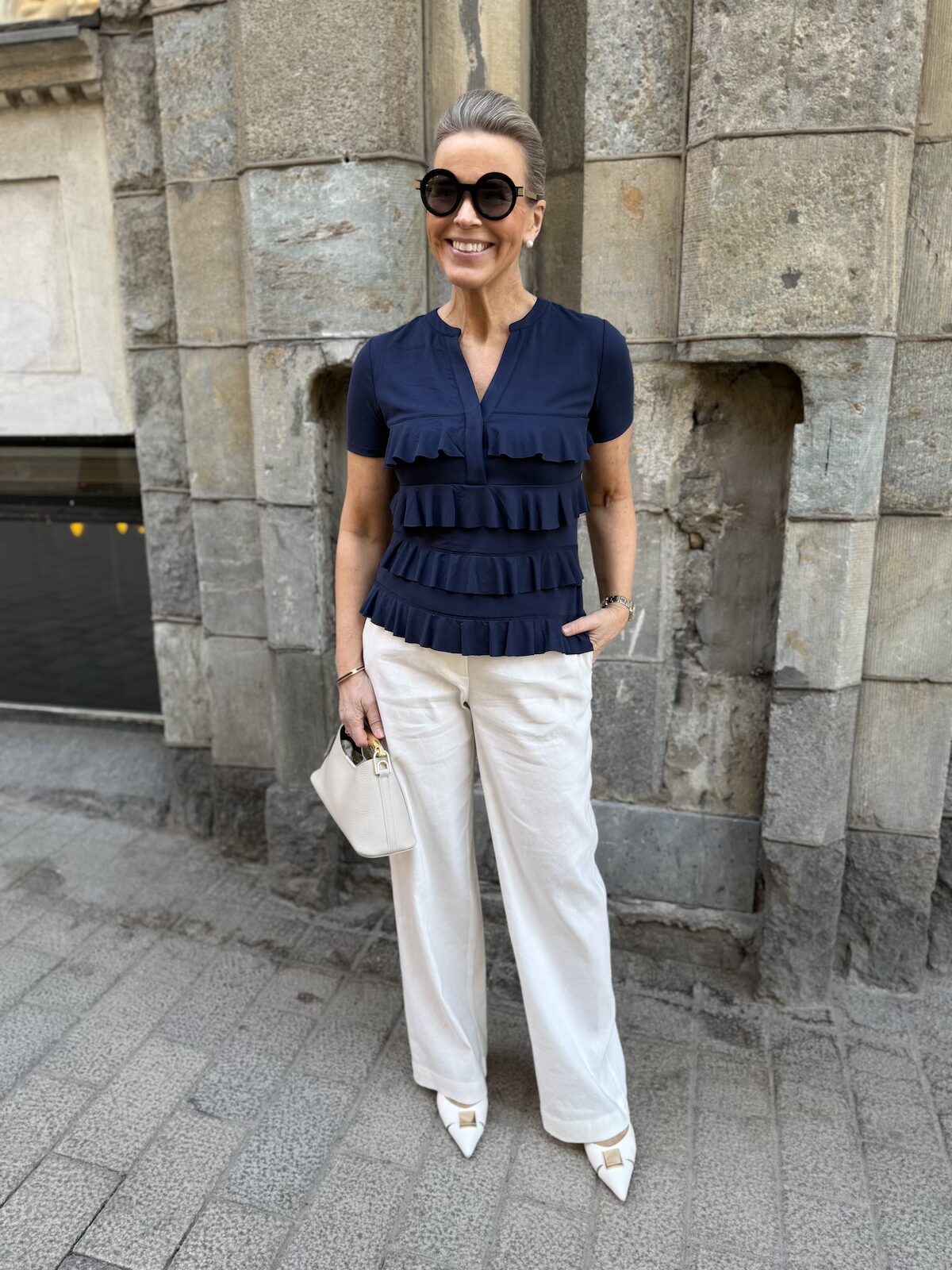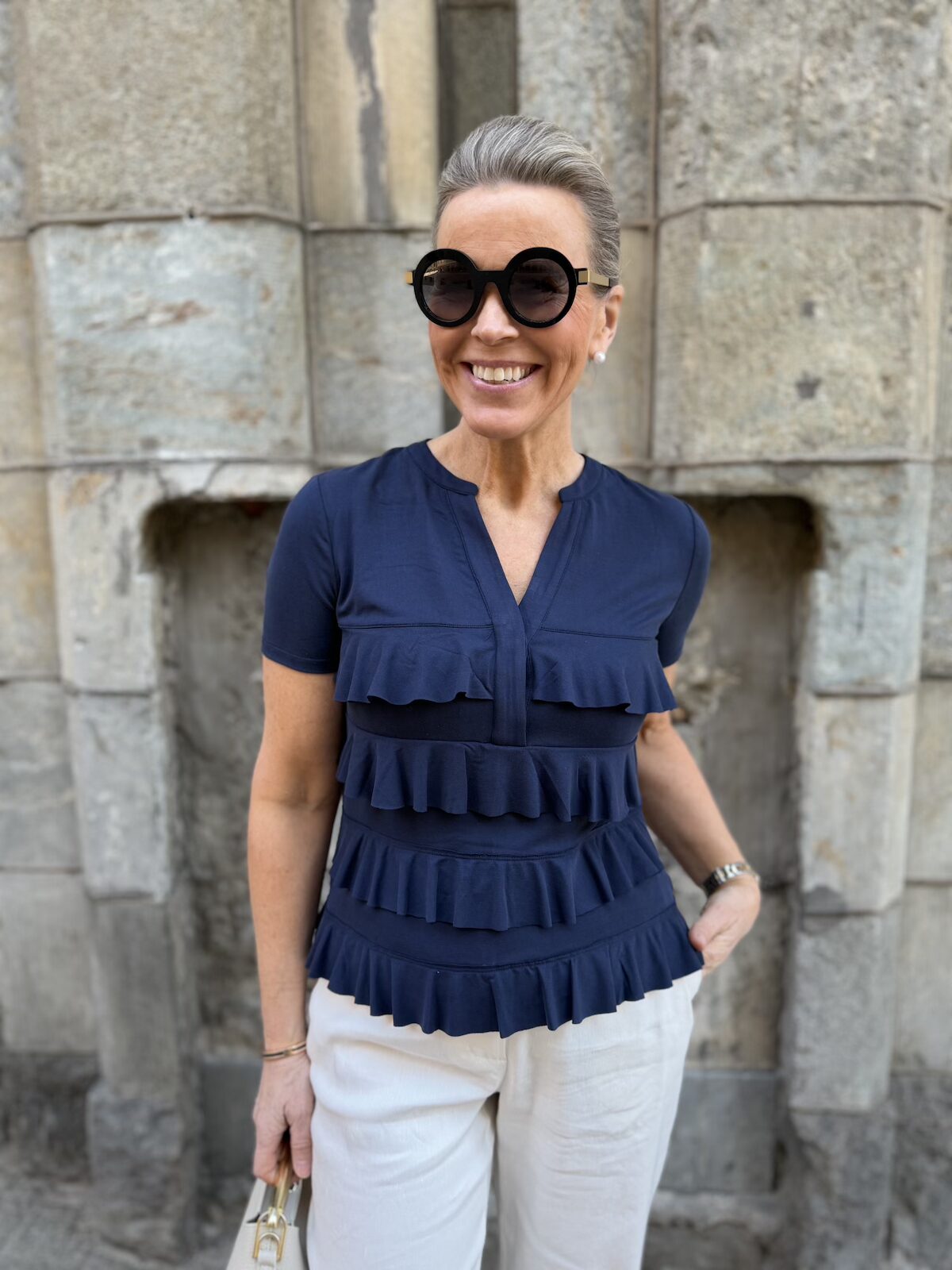 Olaf salsapaita on ihan loistava! Se on pehmoista ja joustavaa materiaalia ja se toimii arkeen ja pieneen menoon. Paidassa on O-kaula-aukko, joka on edestä V-mallinen. Hihat ovat lyhkäiset ja paidassa on kauniita salsakantteja. Paita on aavistuksen slimmattu vyötäröstä eli se istuu kauniisti ja paita loppuu lantiolle. Katalla on paidasta päällä koko XS.