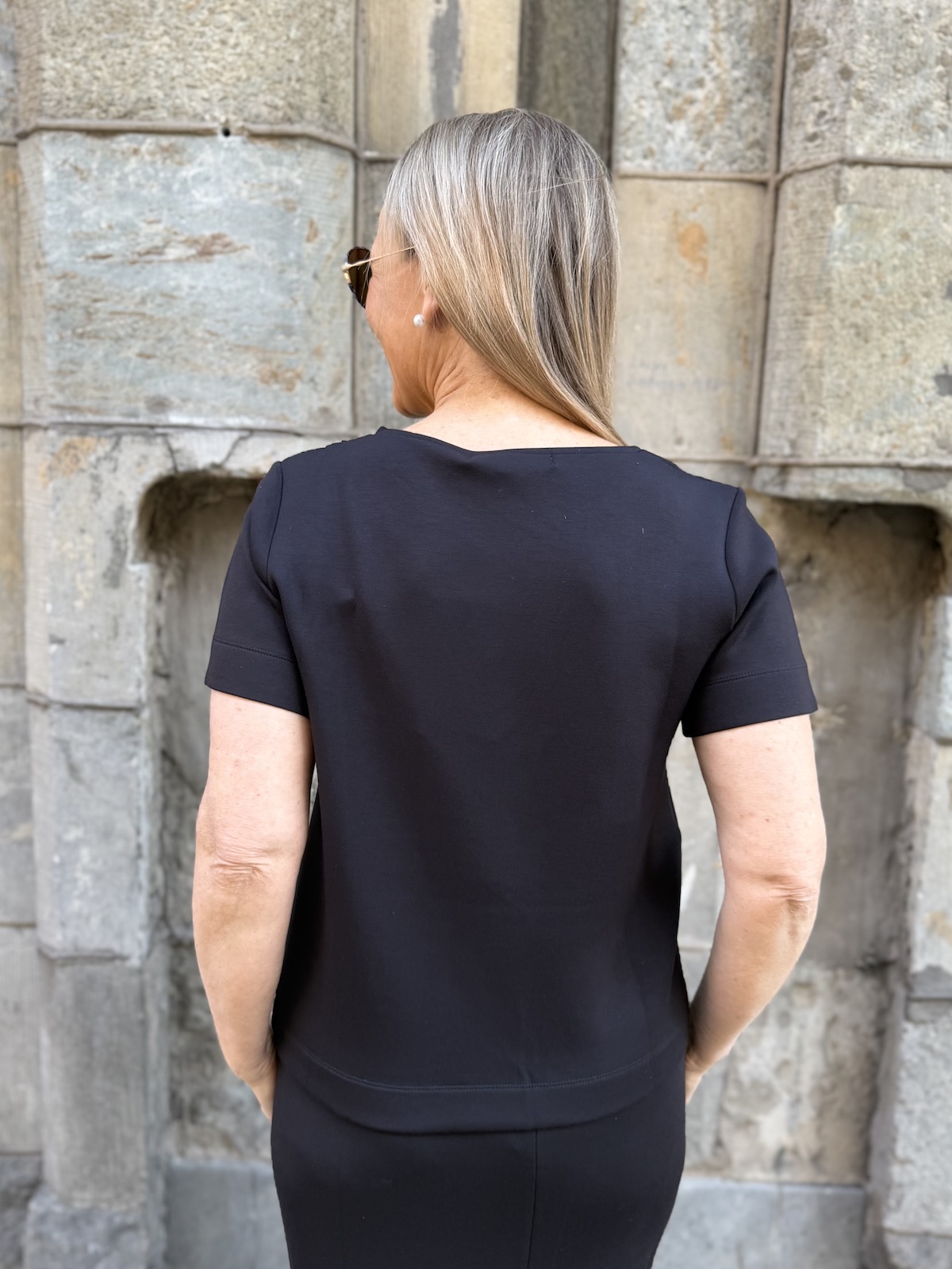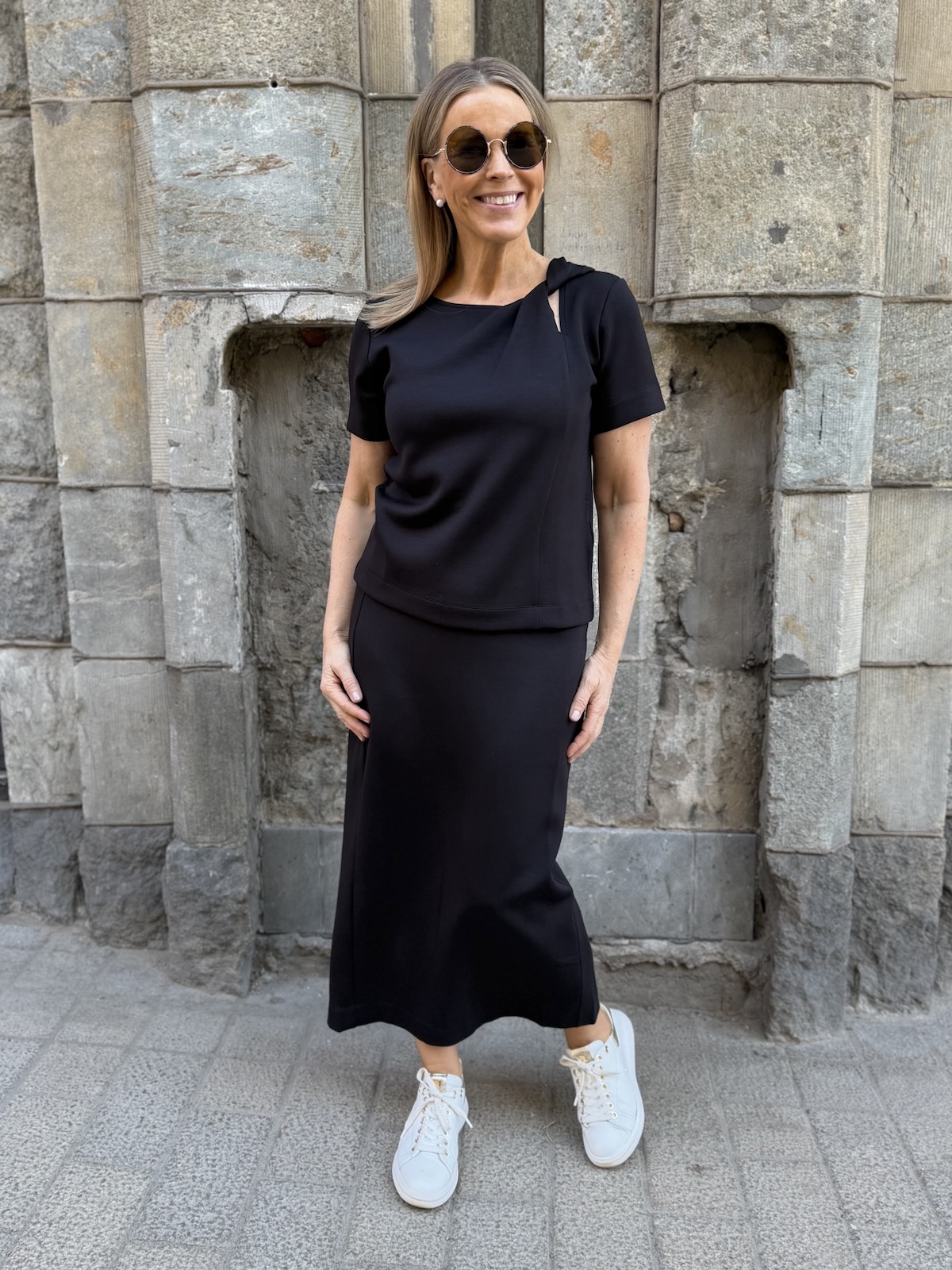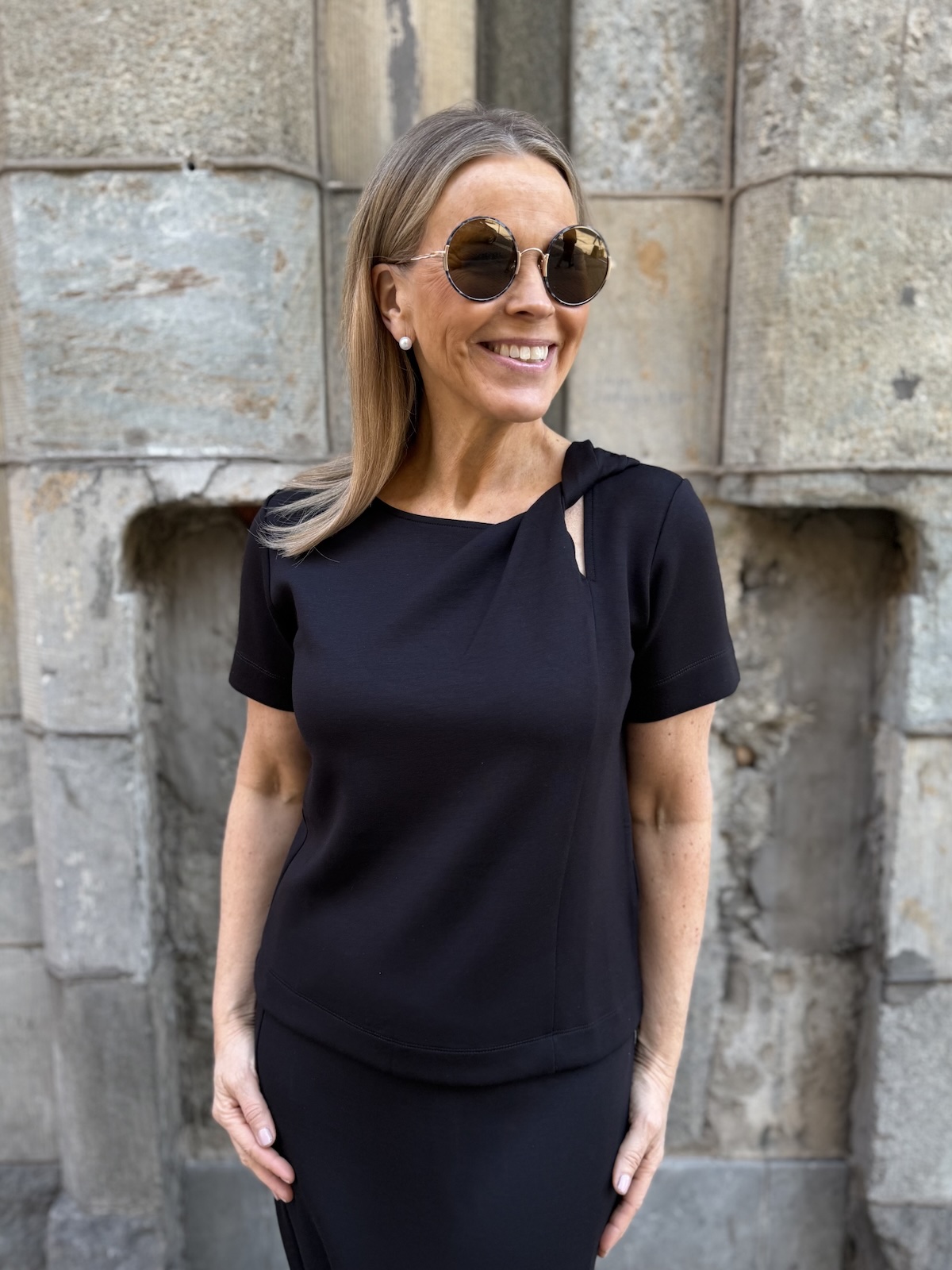 Picue Vincent uusi T-paitamalli on loistava t-paita. Se on juuri sen pituinen, että sitä voi pitää alaosan päällä. T-paidassa on pieni aukko kauluksessa ja hahat ovat lyhkäiset. Malliltaan se on suora ja loppuu lonkkaluiden alapuolelle. Katalla on T-paidasta päällä koko S. Yhdistä T-paita Gincette housuihin ja Aida midihameeseen, niin saat loistavan setin. T-paitaa on valmistettu ainoastaan mustana.