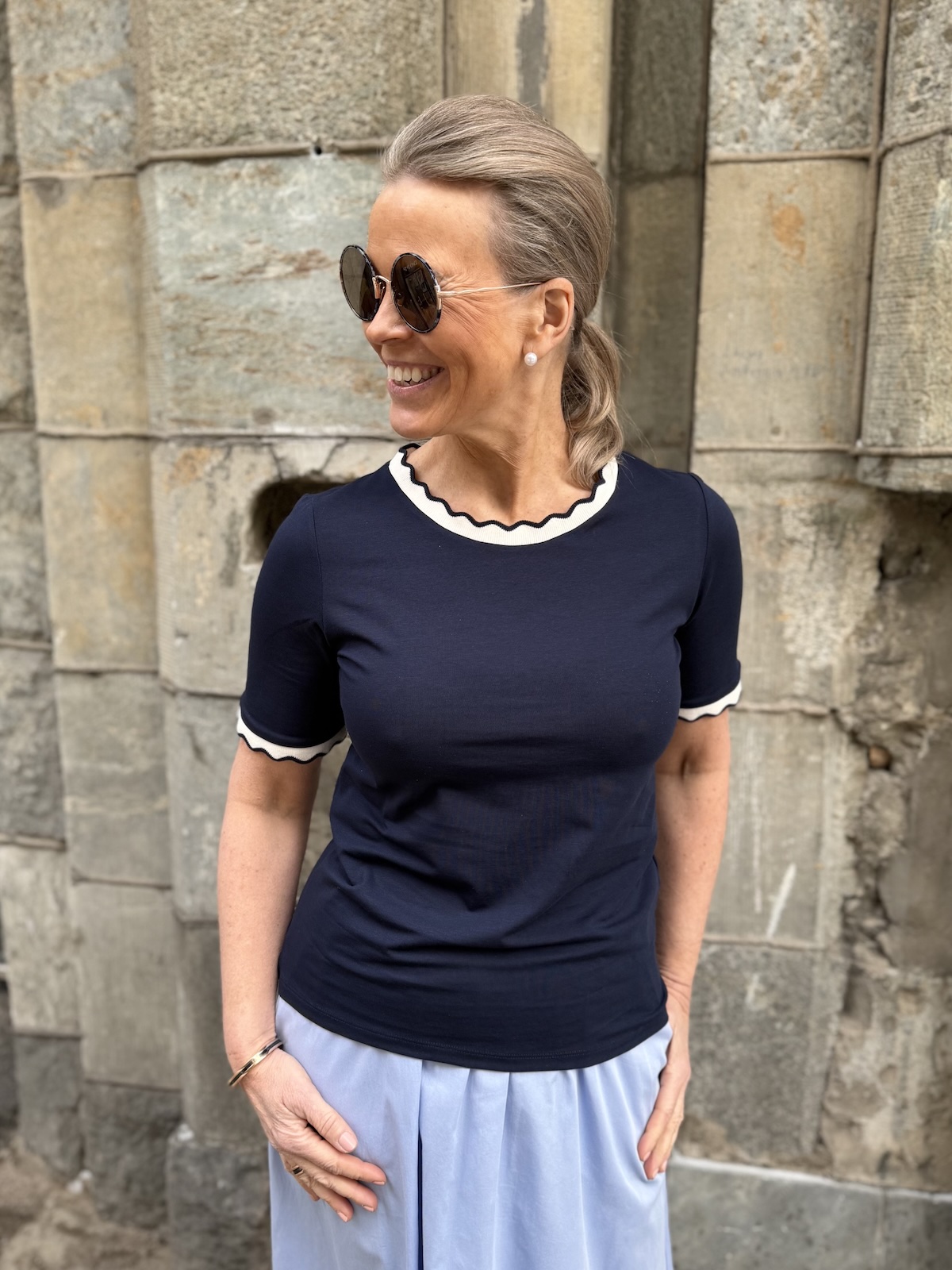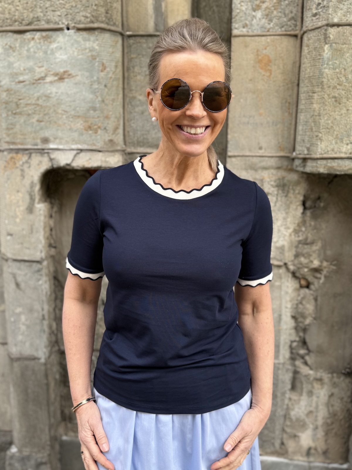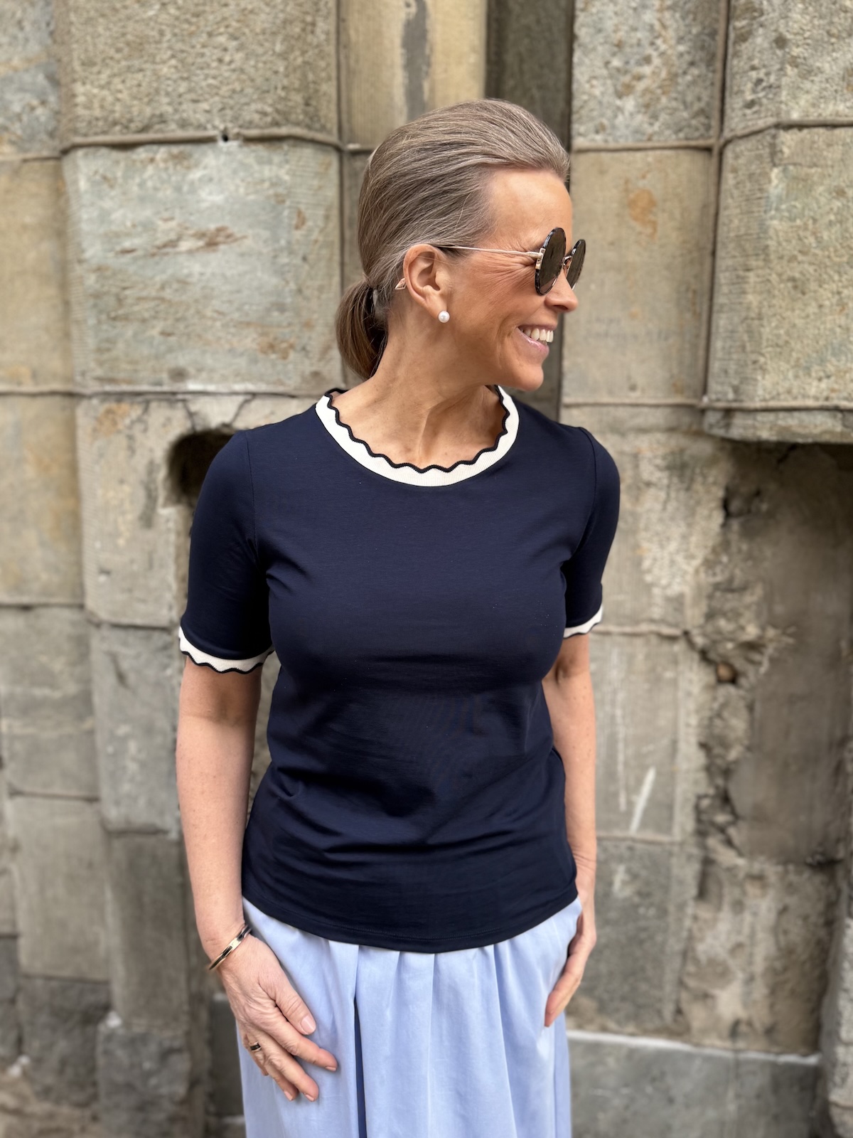 Reil T-paidassa on kaunis kaula-aukko ja hihasuut. Ne näyttävät ”piparkakkureunoilta”. T-piadassa on todella ihana materiaali, joustava ja tyylikäs laatu. Malliltaan t-paita on suora ja se ylettyy hyvin lantiolle. Katalla on paidasta päällä koko 34. T-paita vastaa normaalia kokoa, mutta kahden koon välissä, ota pienempi koko. Alla olevat mitat ovat ilman venytystä. T-paita venyy noin 6 cm alla oleviin mittoihin.