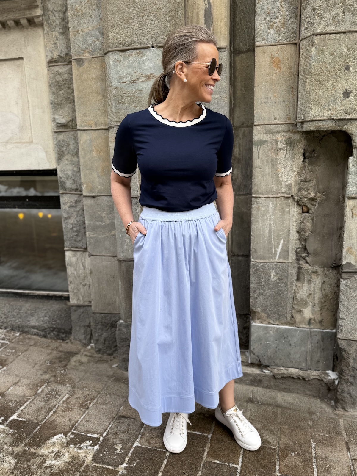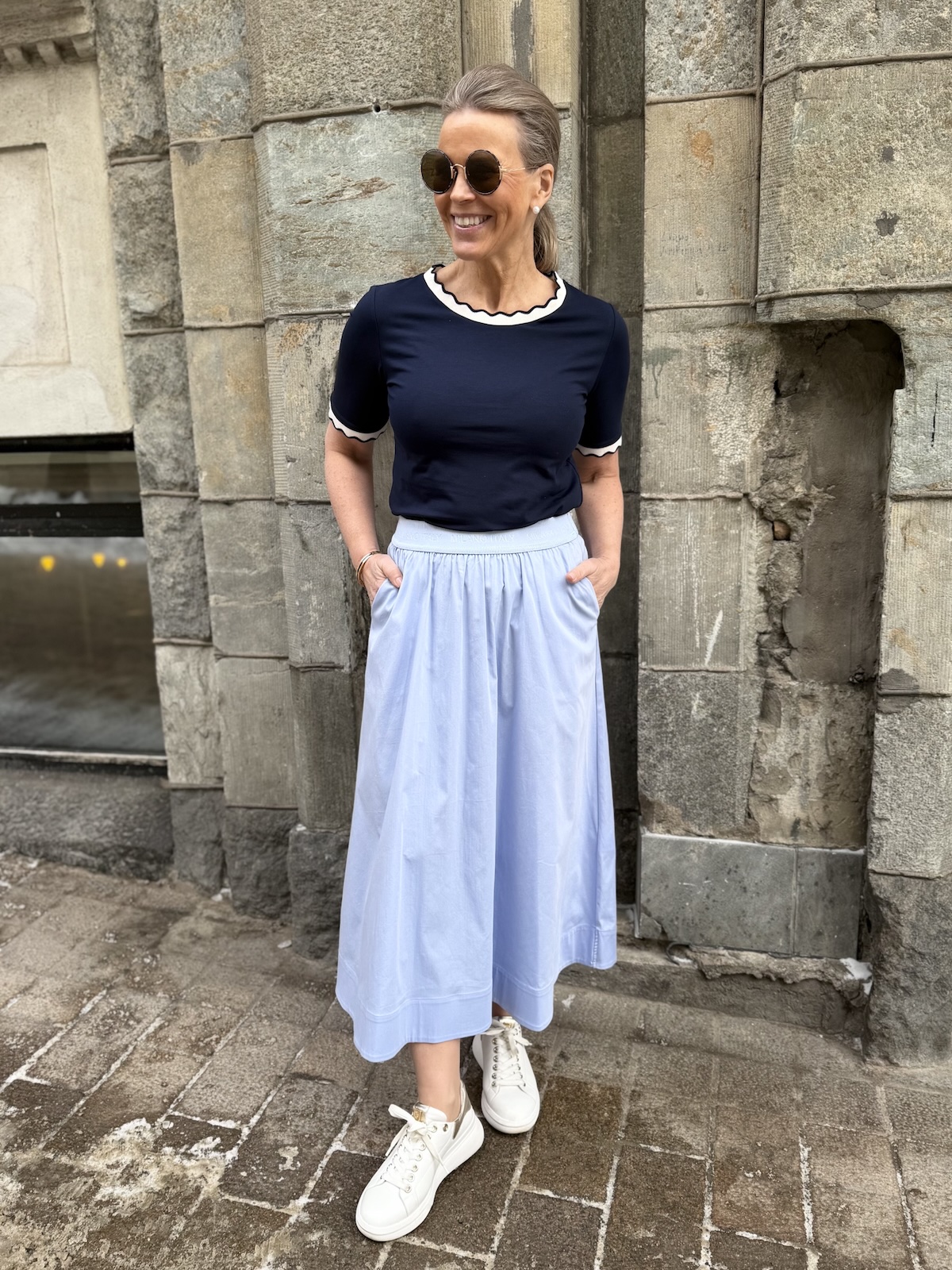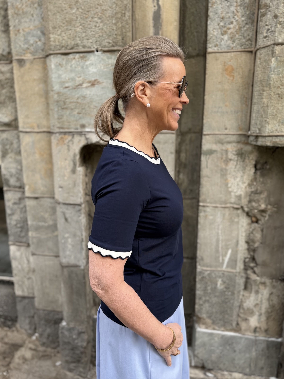 Reil T-paidassa on kaunis kaula-aukko ja hihasuut. Ne näyttävät ”piparkakkureunoilta”. T-piadassa on todella ihana materiaali, joustava ja tyylikäs laatu. Malliltaan t-paita on suora ja se ylettyy hyvin lantiolle. Katalla on paidasta päällä koko 34. T-paita vastaa normaalia kokoa, mutta kahden koon välissä, ota pienempi koko. Alla olevat mitat ovat ilman venytystä. T-paita venyy noin 6 cm alla oleviin mittoihin.