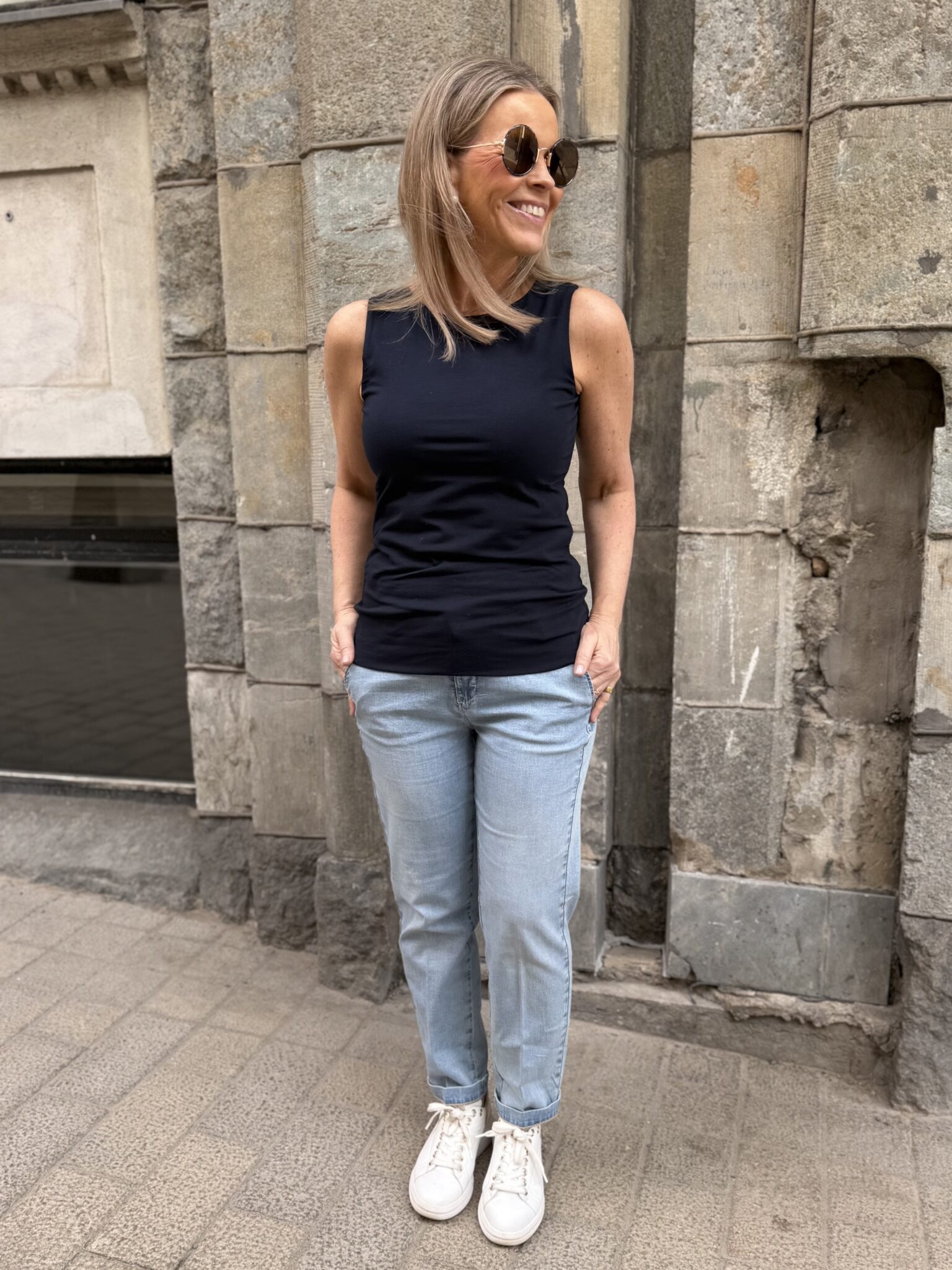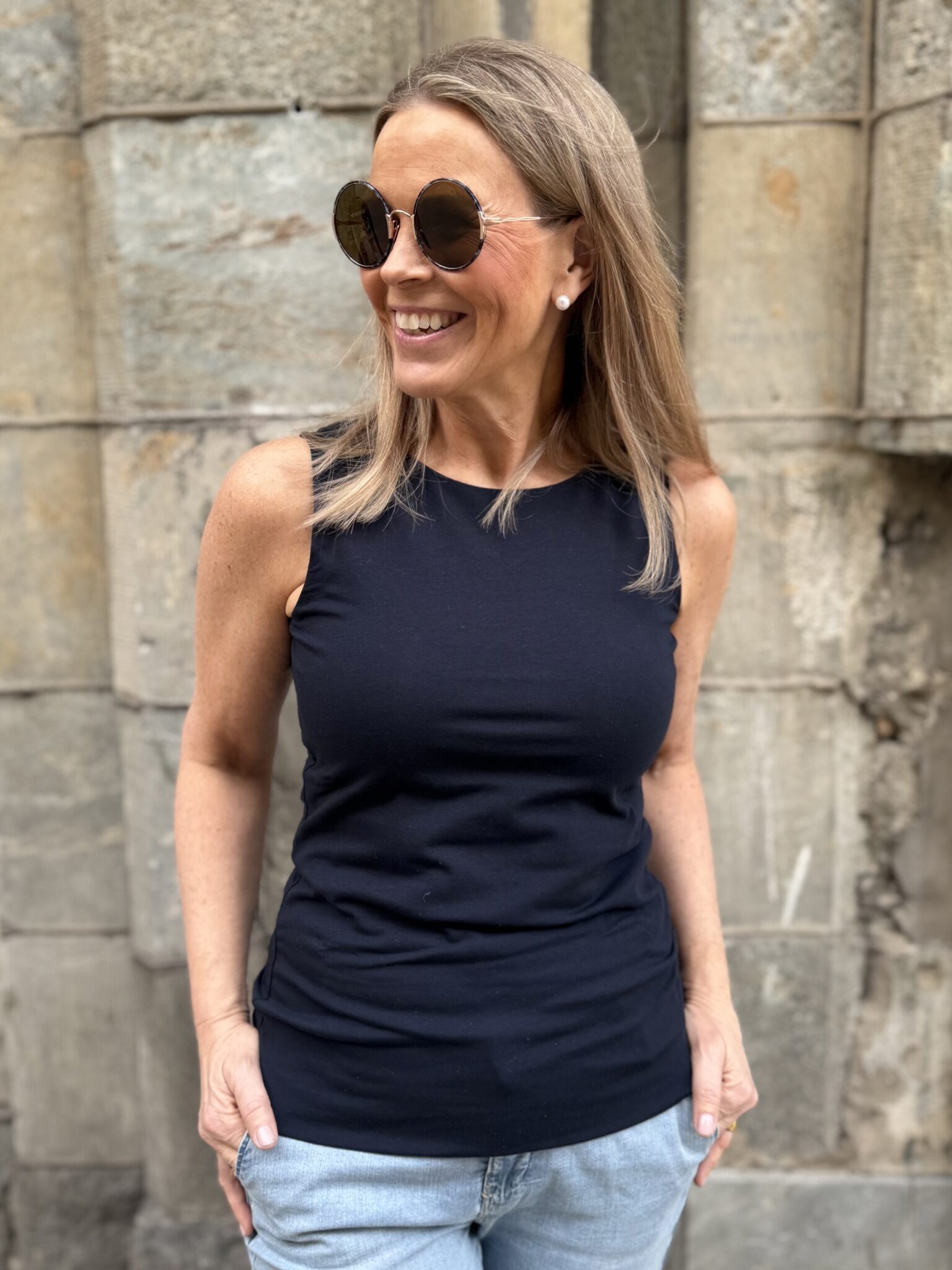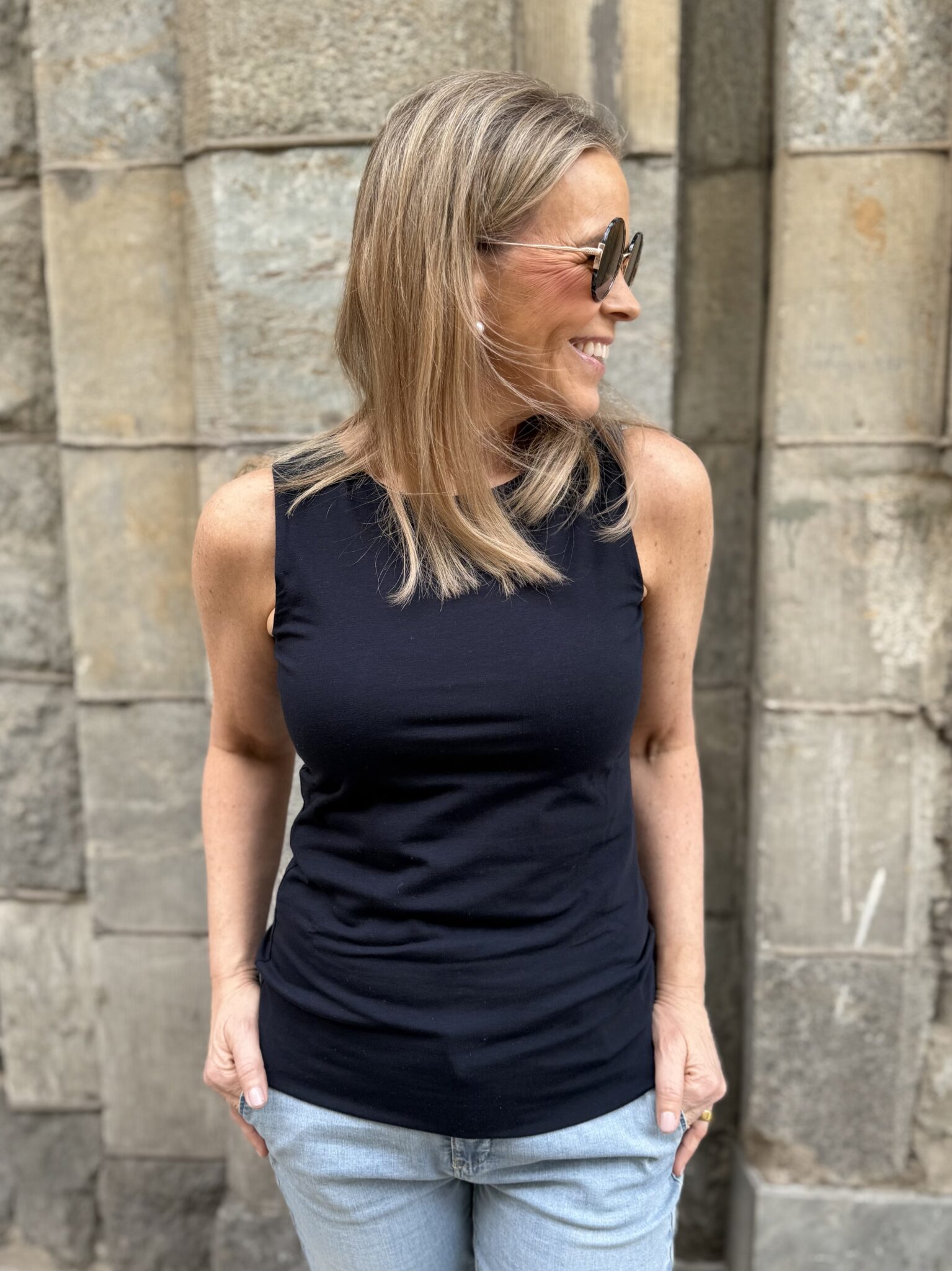 Tuplatopissa on tuplakankainen etuosa eli valkoisestakaan topista ei näy läpi. Malliltaan toppi on vartalonmyötäinen. Suosittelemme ottamaan topista max. oman koon tai yhden koon pienemmän. Jos toppi on liian iso, ei kaulus nappaa vartaloon kiinni, vaan jättää aukon eteen. Toppi ylettyy reilusti lantiolle. Katalla on topista päällä koko 34 ja se on hänelle loistava koko. Toppi joustaa.