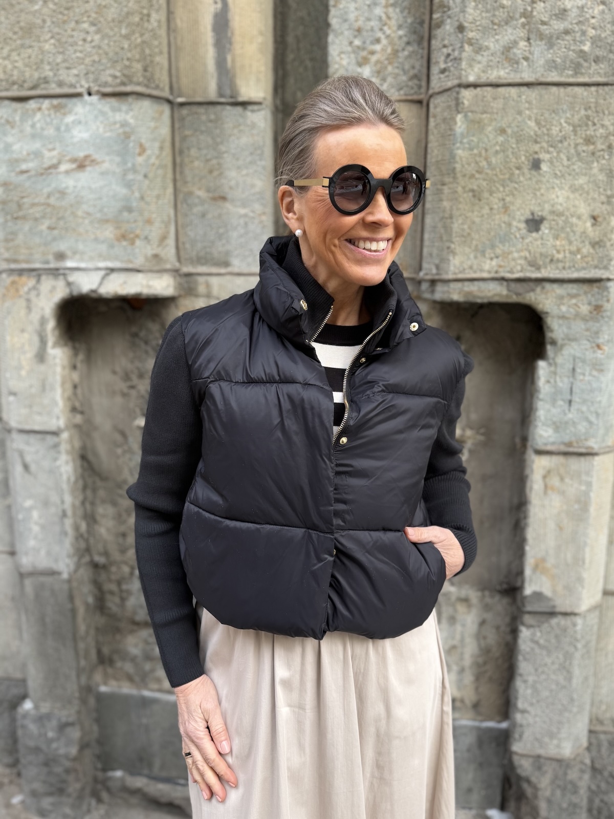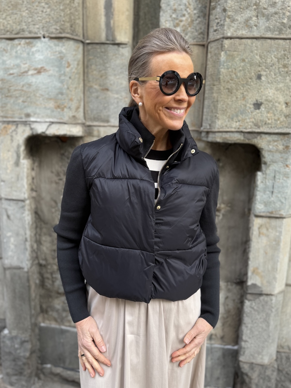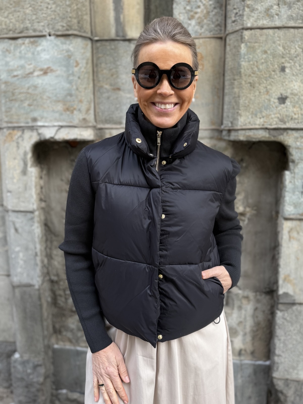 Harper pusakka neuloshihoilla on kerrassaan ylellisen tuntuinen pusakka! Pusakassa on polyesteri vanu sisällä. Hihat ja sisäkaulus ovat joustavaa neulosta. Edessä on sekä painonapit että kullanvärinen vetoketju. Kauluksen saa kuvan mukaisesti ihan ylös asti kiinni. Pusakan sisällä, helmassa on kiristysnauhat eli helman saa kiristettyä ja käännettyä pussille (katso kuva). Pusakan sivuissa on taskut. Pusakka ylettyy lantiolle. katalla on pusakasta päällä koko 34. Pusakka on reiluhkoa kokoa ja hihat joustavat reilusti. Rinnan ympäryksen mittaan ei tule jäädä enempää kuin 6-10 cm tilaa. (Katalla jää noin 12 cm, sekin on ok, mutta enempää ei tule jäädä).