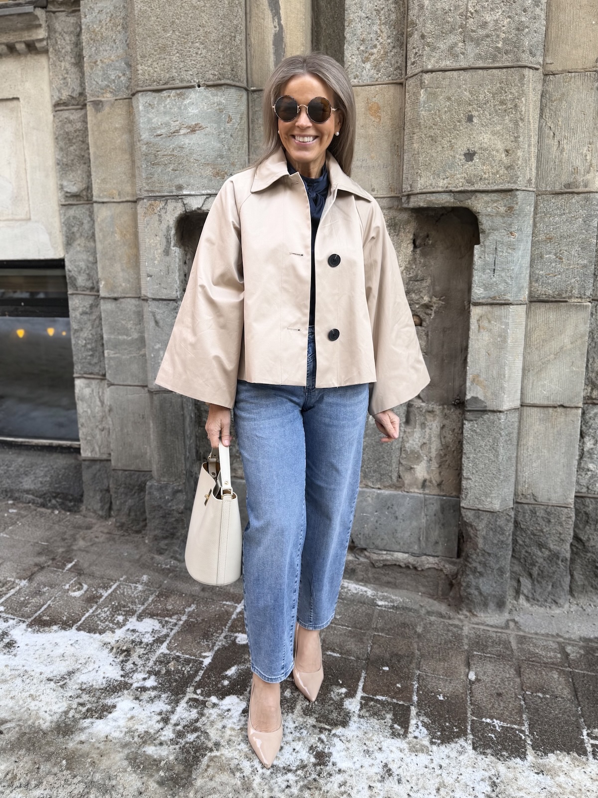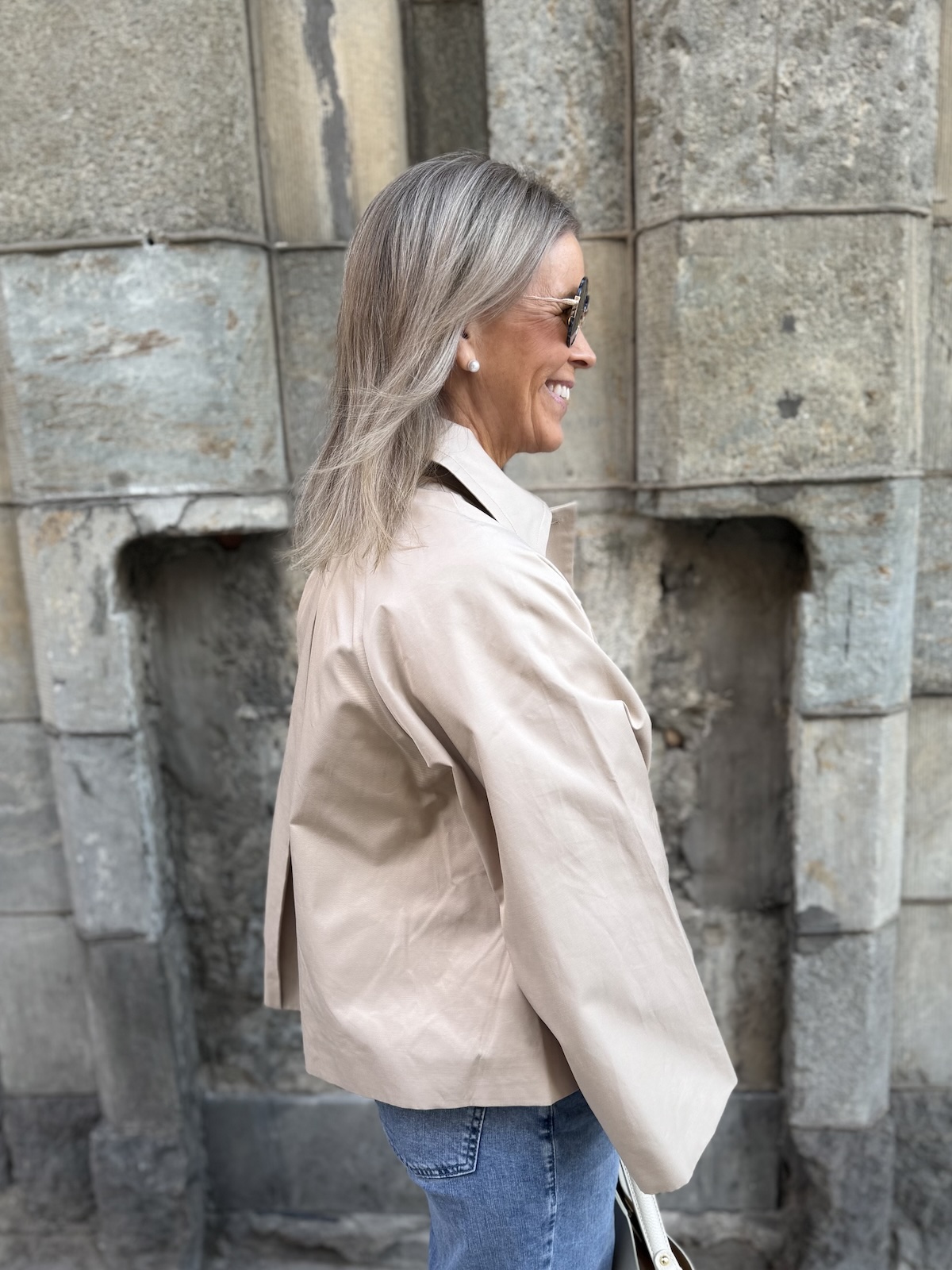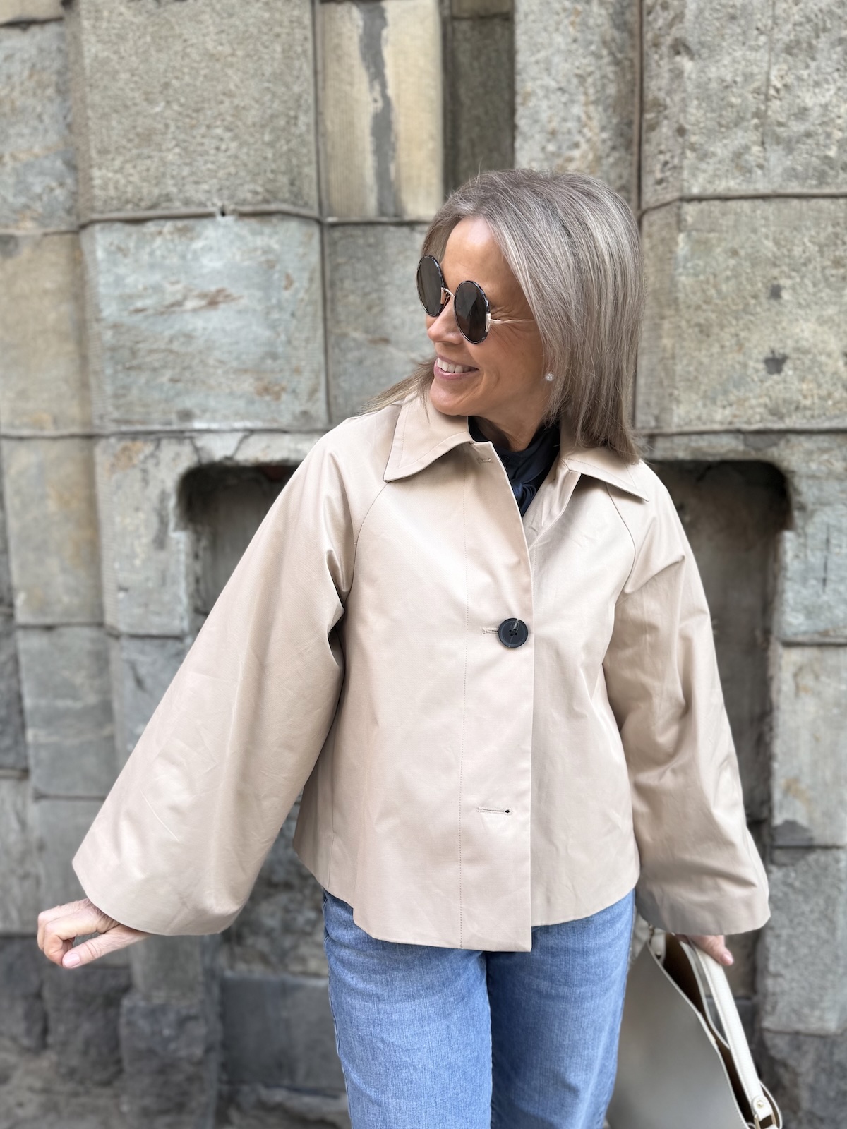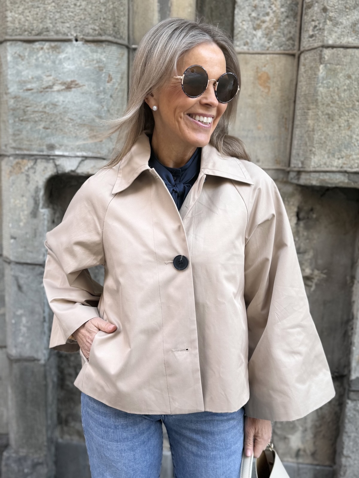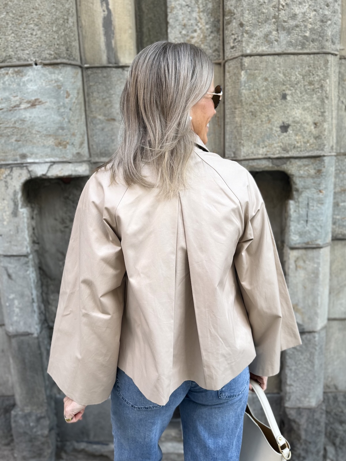 Hinona on super söpö keeppitakki. Takissa on kaulukset ja edessä on kauniit napit. Hihat ovat leveähköt. Takki levenee alaspäin ja loppuu lantiolle. Takin selkäpuolella on yksi laskos, joka antaa tilaa takille. Katalla on takista päällä koko 34.