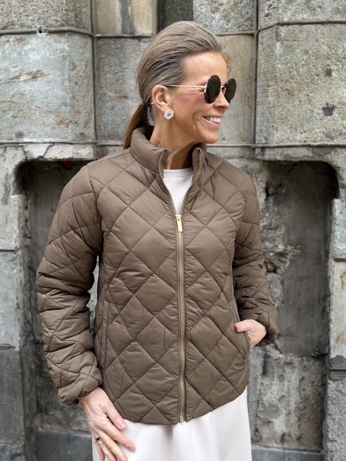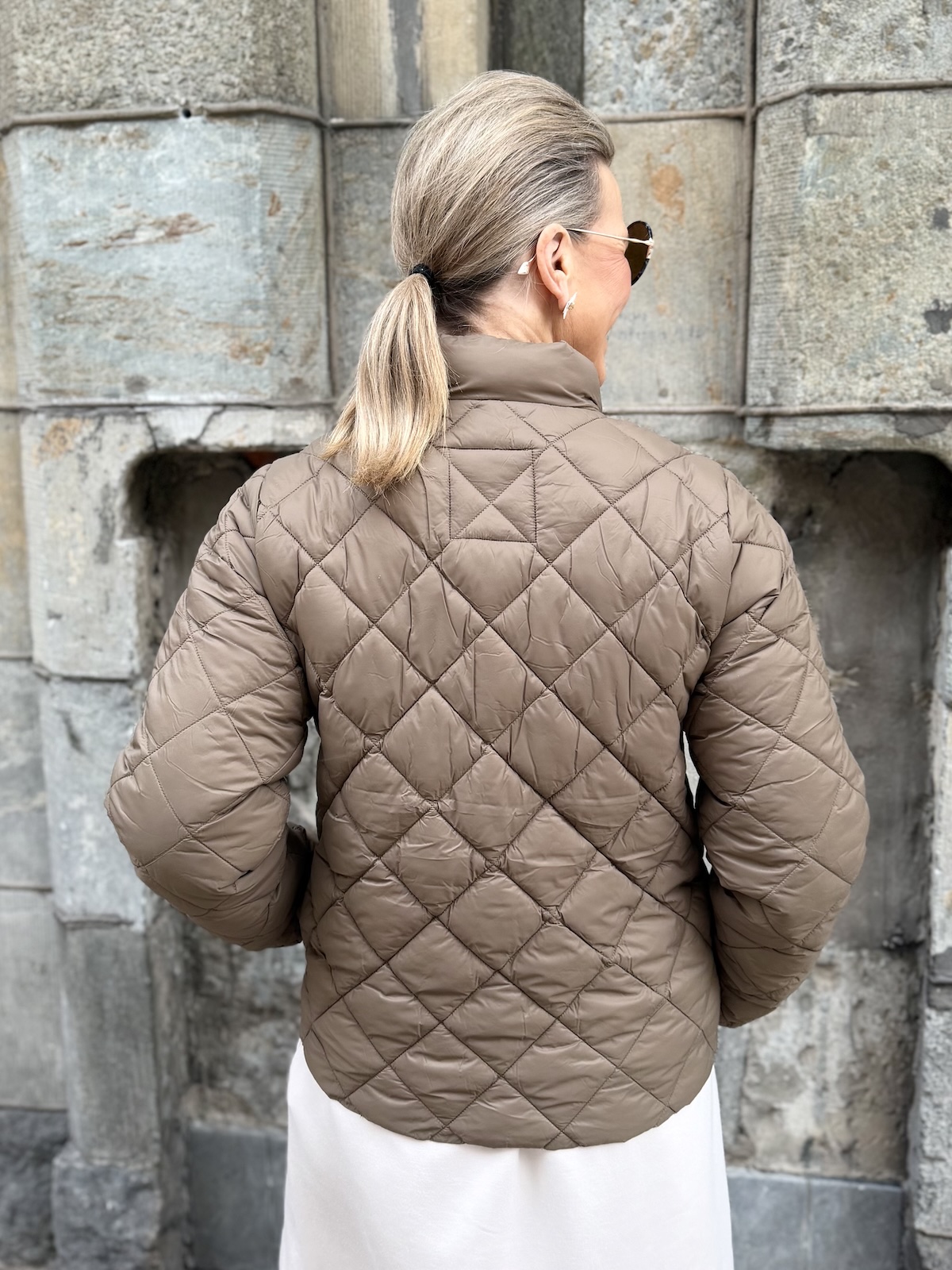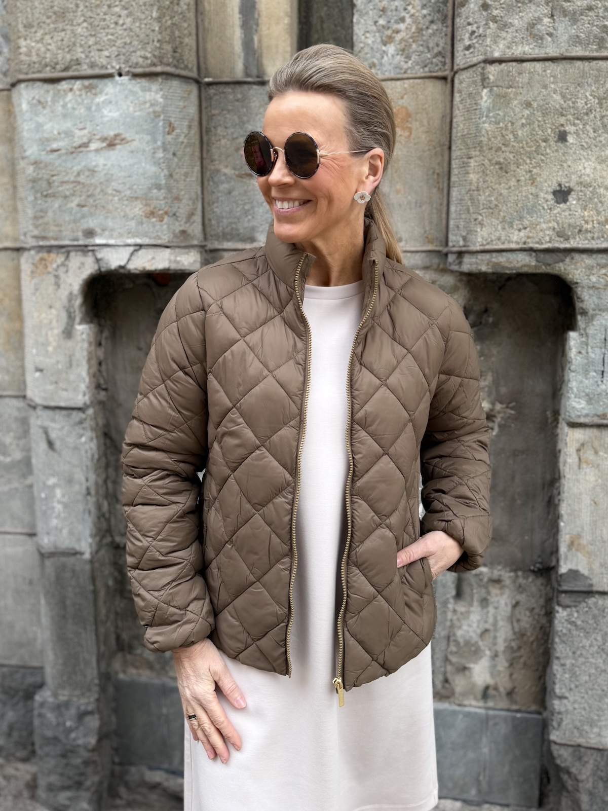 Olia on helppo, kevyt ja mukava takki. Takissa on vanu vuori. Edessä on kullanvärinen vetoketju ja sivuissa on taskut. Takissa on pystykaulus ja malliltaan takki on suora ja se ylettyy lantiolle. Katalla on takista päällä koko 34.