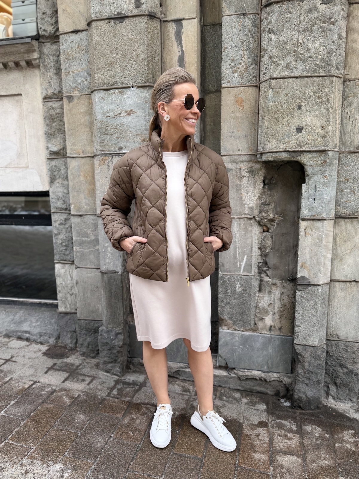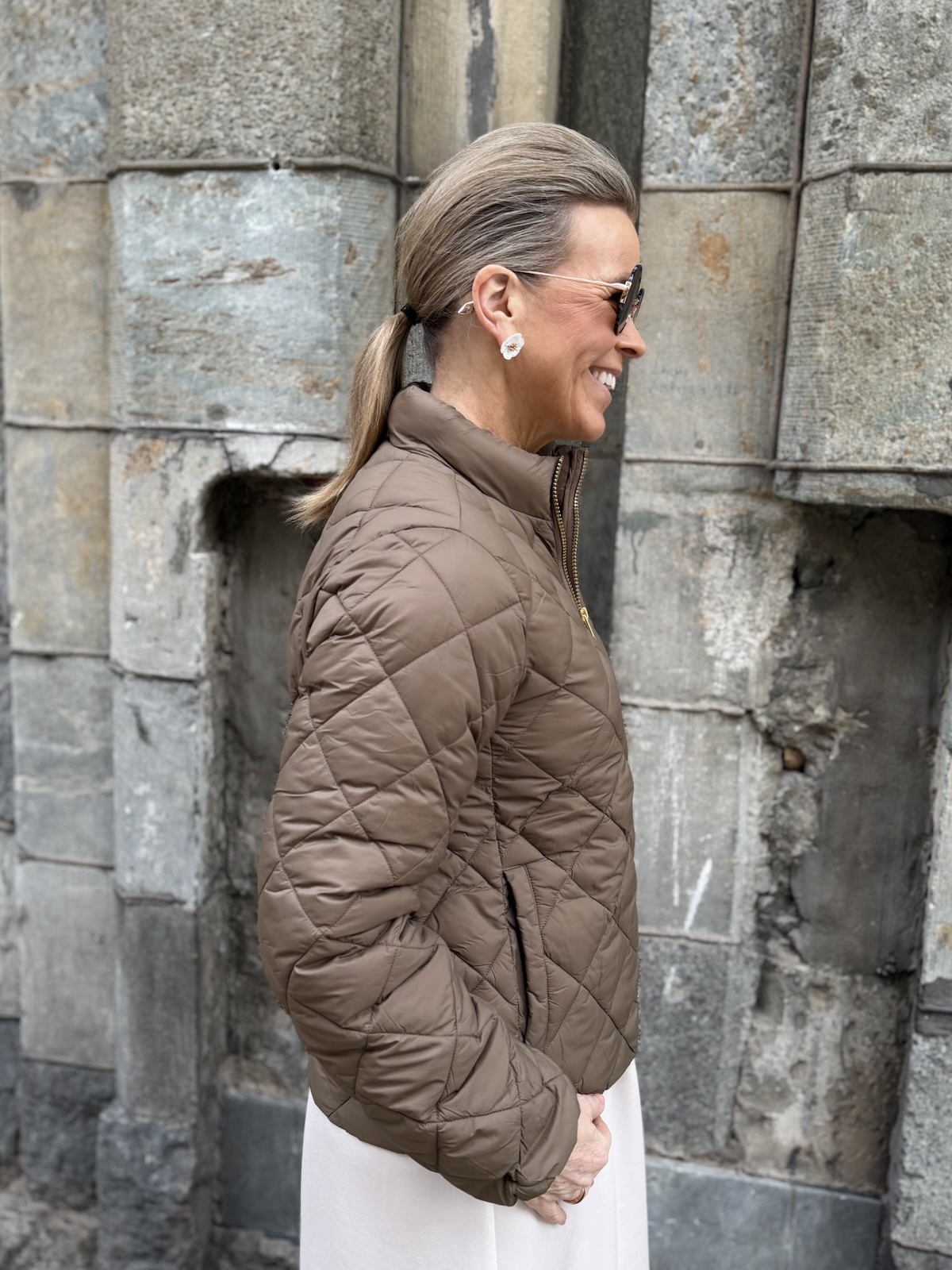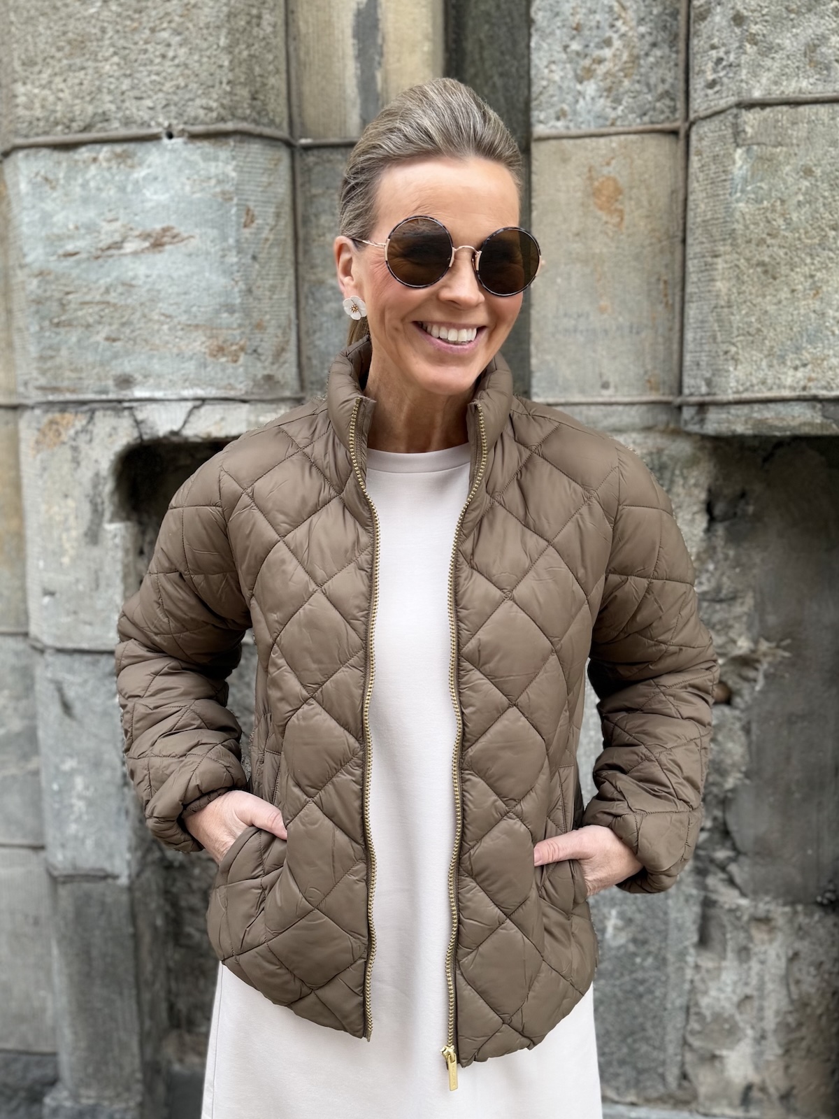 Olia on helppo, kevyt ja mukava takki. Takissa on vanu vuori. Edessä on kullanvärinen vetoketju ja sivuissa on taskut. Takissa on pystykaulus ja malliltaan takki on suora ja se ylettyy lantiolle. Katalla on takista päällä koko 34.