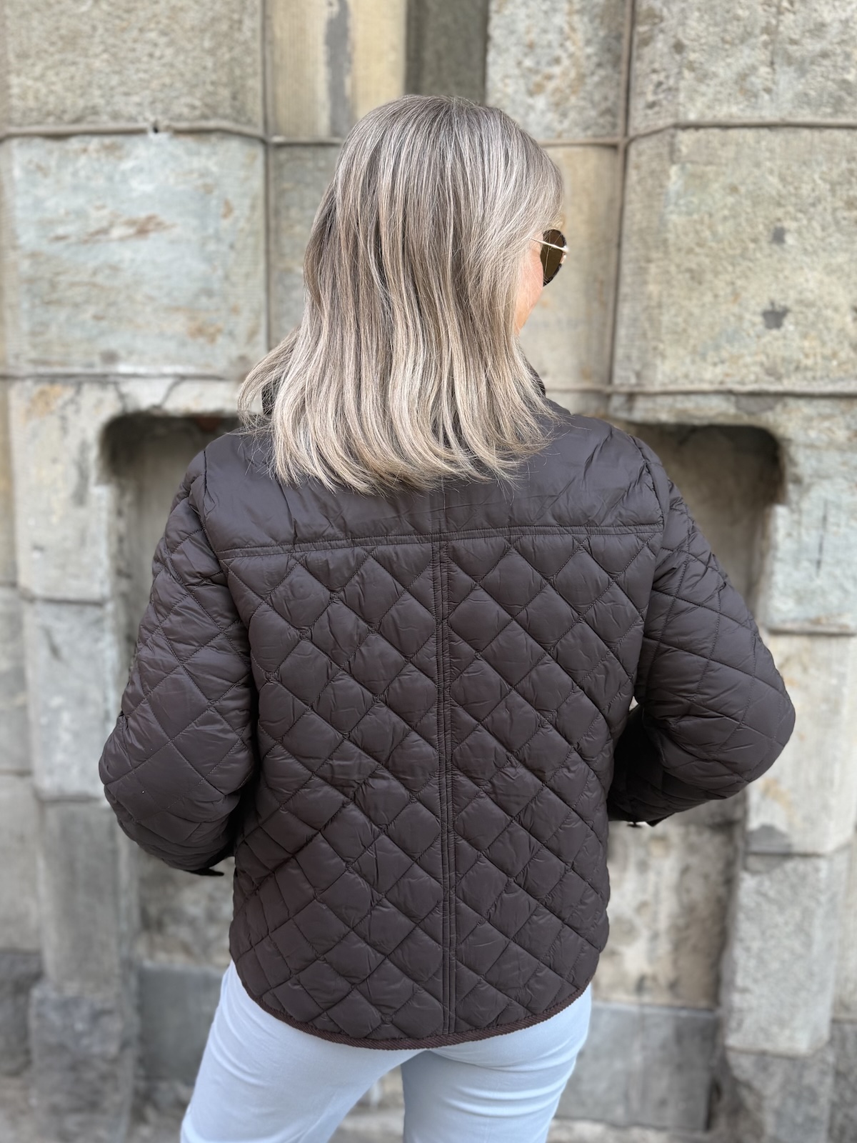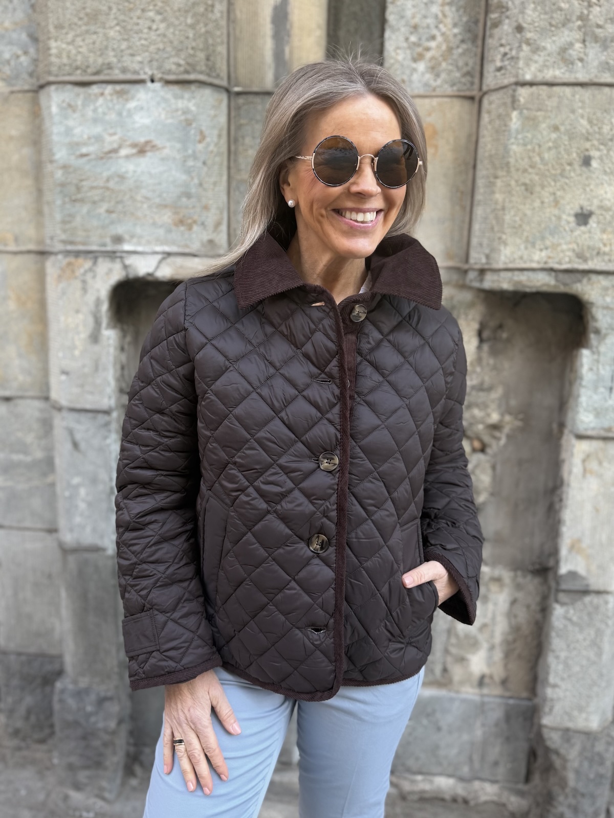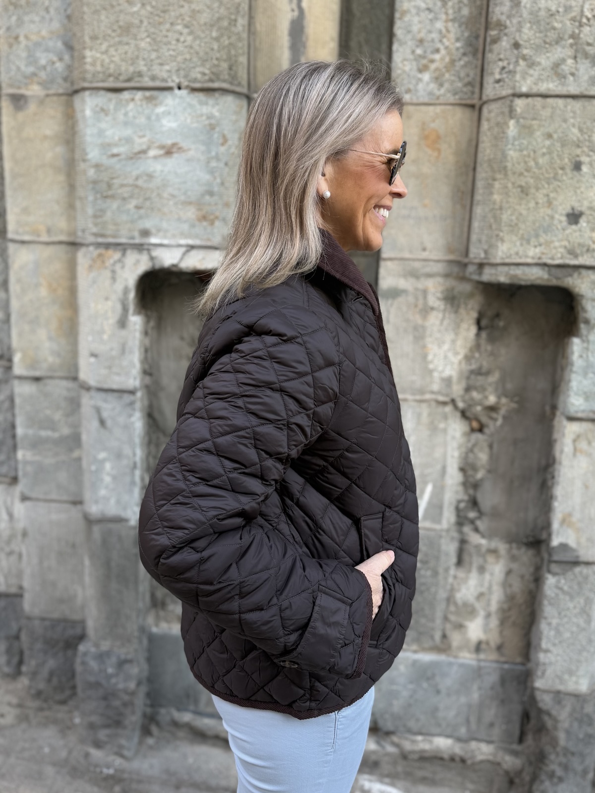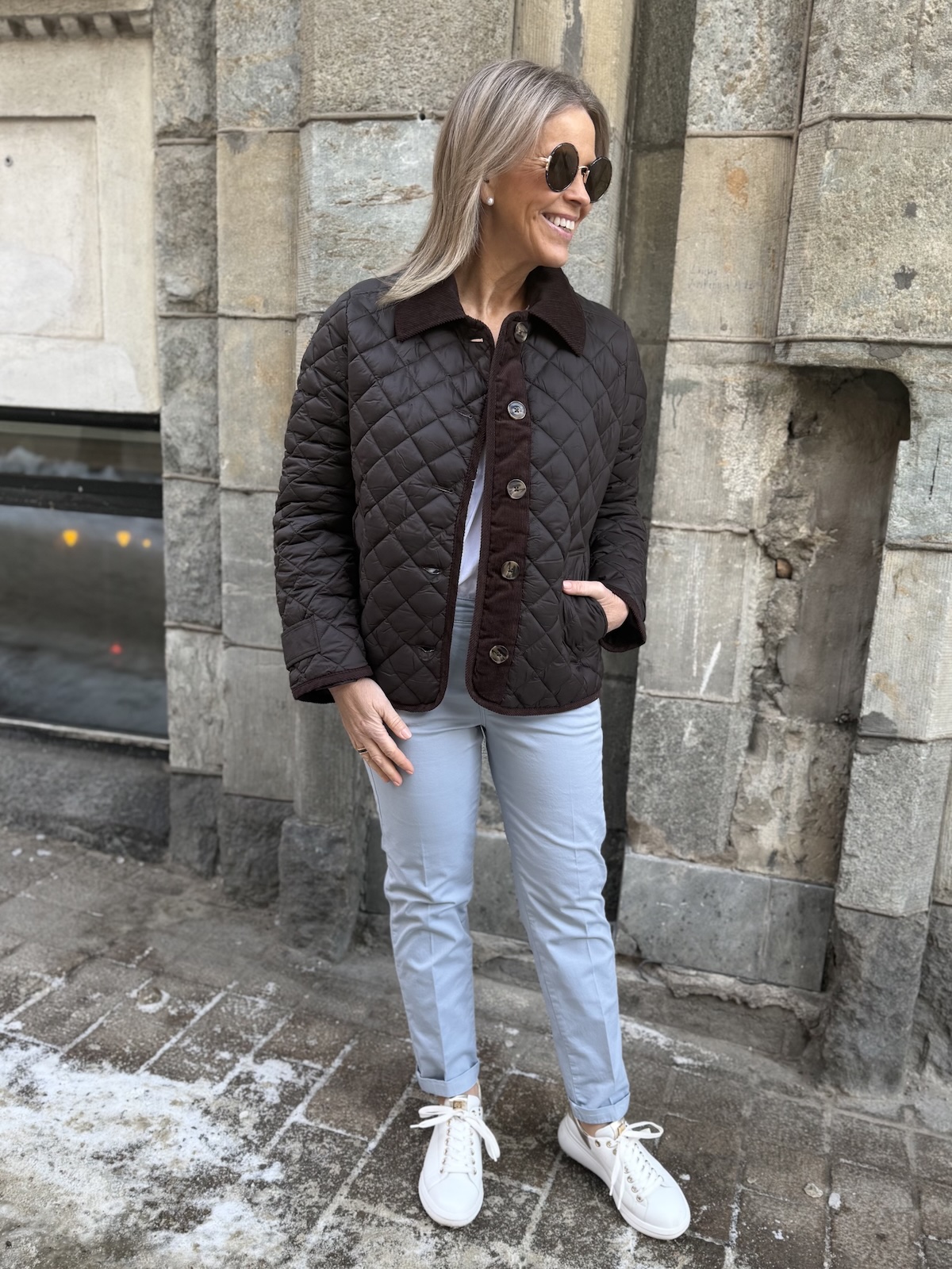 Safiya on tyylikäs, kauniisti työstetty ja ajaton tikkitakki. Takissa on klassinen salmiakki kuvio. Kaulukset ja nappilista ovat sävy sävyyn olevaa samettia. Takin helmaa ja hihasuita kiertää myös ohkaiset samettikantit. Edessä on isot napit ja sivuissa on viistotaskut. Hihansuissa on tampit. Malliltaan takki on suora ja se loppuu lantiolle. Katalla on takista päällä koko 34. Takki on yhden koon reilumpaa kuin normaalisti. Katso mitat. Rinnanympärykseen on hyvä jäädä noin 8-10 cm tilaa.