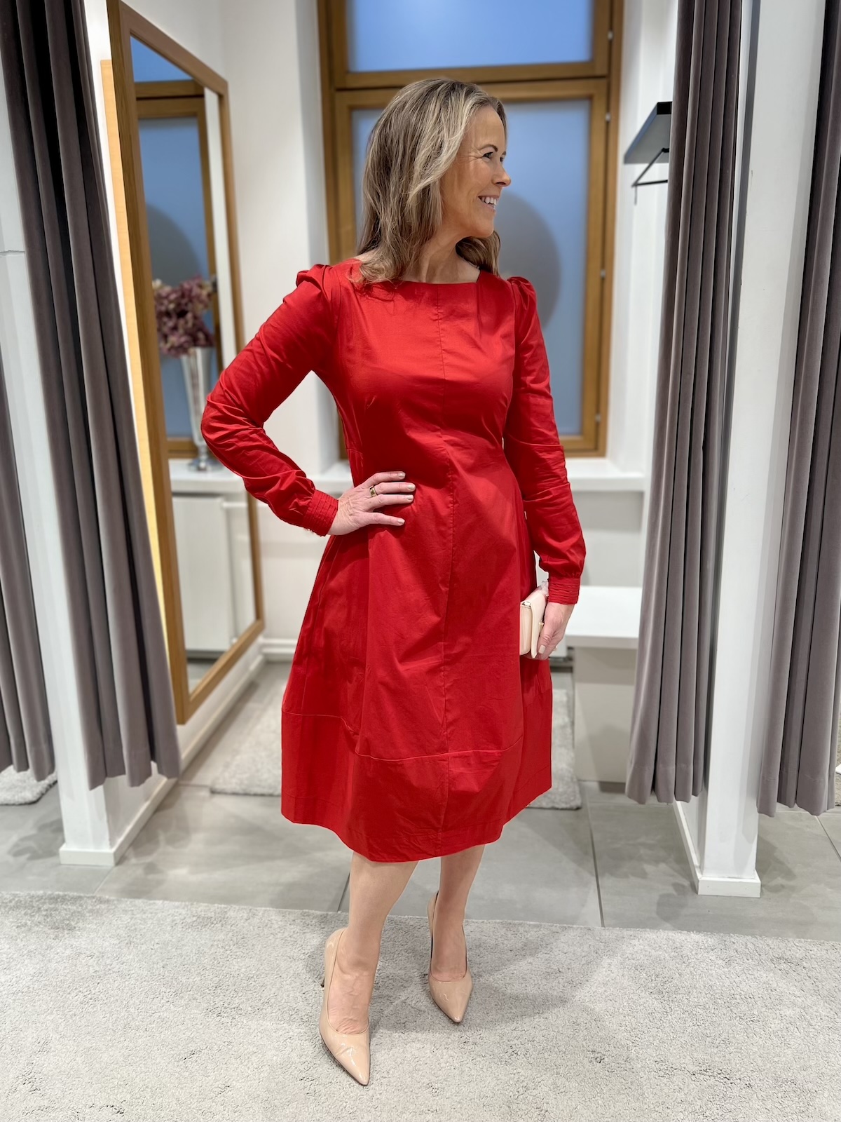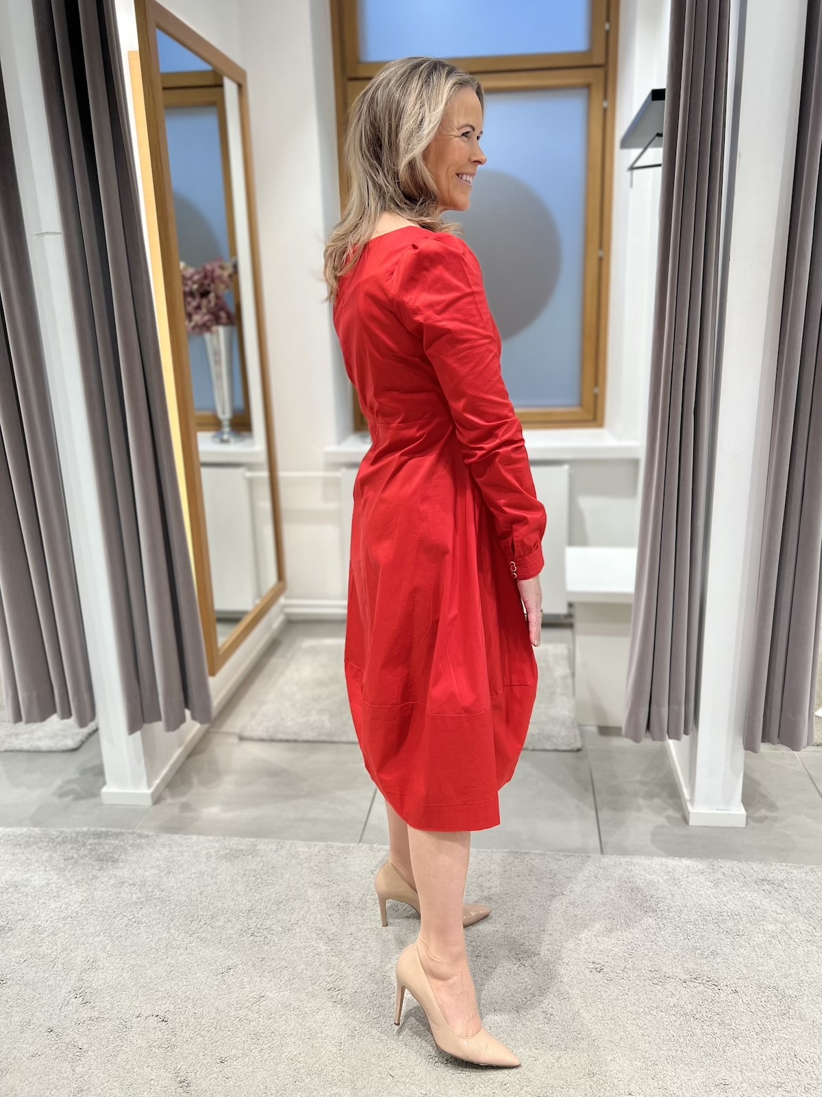 Antoinett pallomekko on sympaattinen! Mekossa on hieman venemallinen kaula-aukko. Olkapäillä on muutama vekki ja hihat ovat pitkät. Hihansuissa on kauniit musta/kultaiset napit. Mekon sivuissa on taskut. Mekko on vartalonmyötäinen ja siro ylhäältä ja vyötärön jälkeen mekko pyöristyy helmaa kohden eli helma on pallomainen. Mekko on reilumpaa kokoa (yksi koko) kuin normaalisti. Siitä ei saa ottaa liian isoa kokoa, muuten se roikkuu eikä pallomaisuus näytä sievältä. Katalla on mekosta päällä koko XS. Mekko loppuu polven alapuolelle.