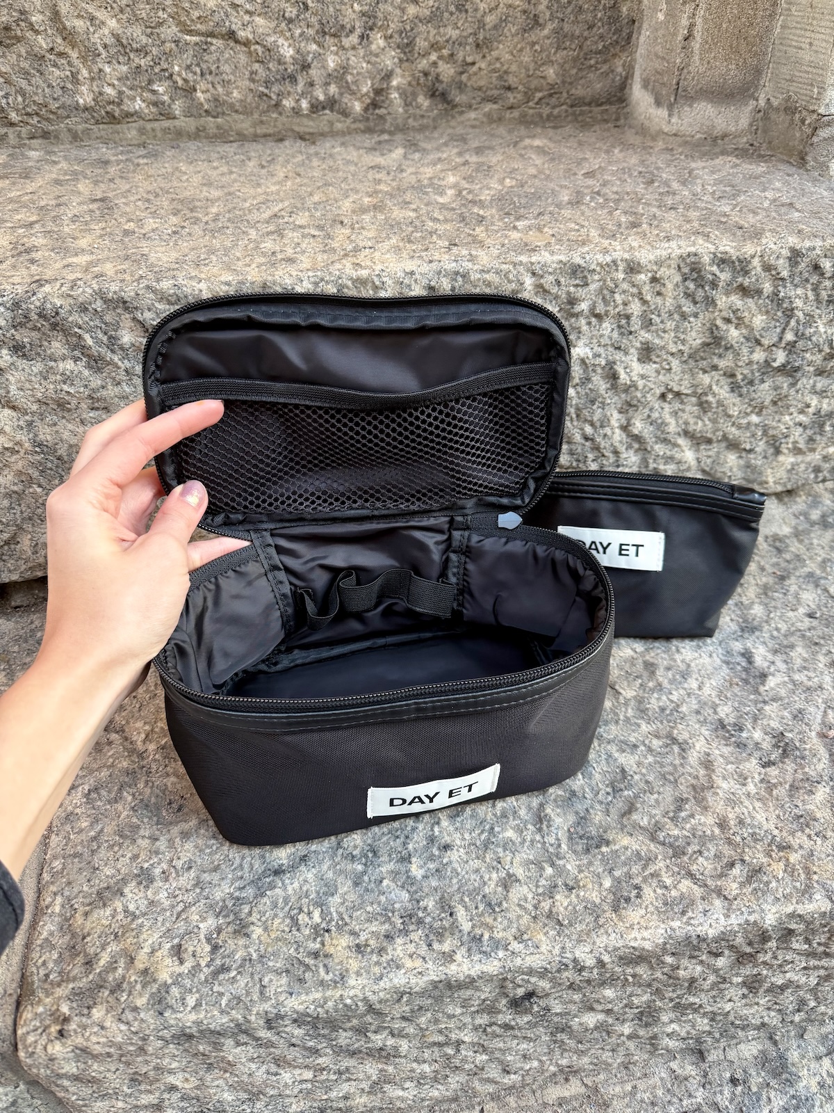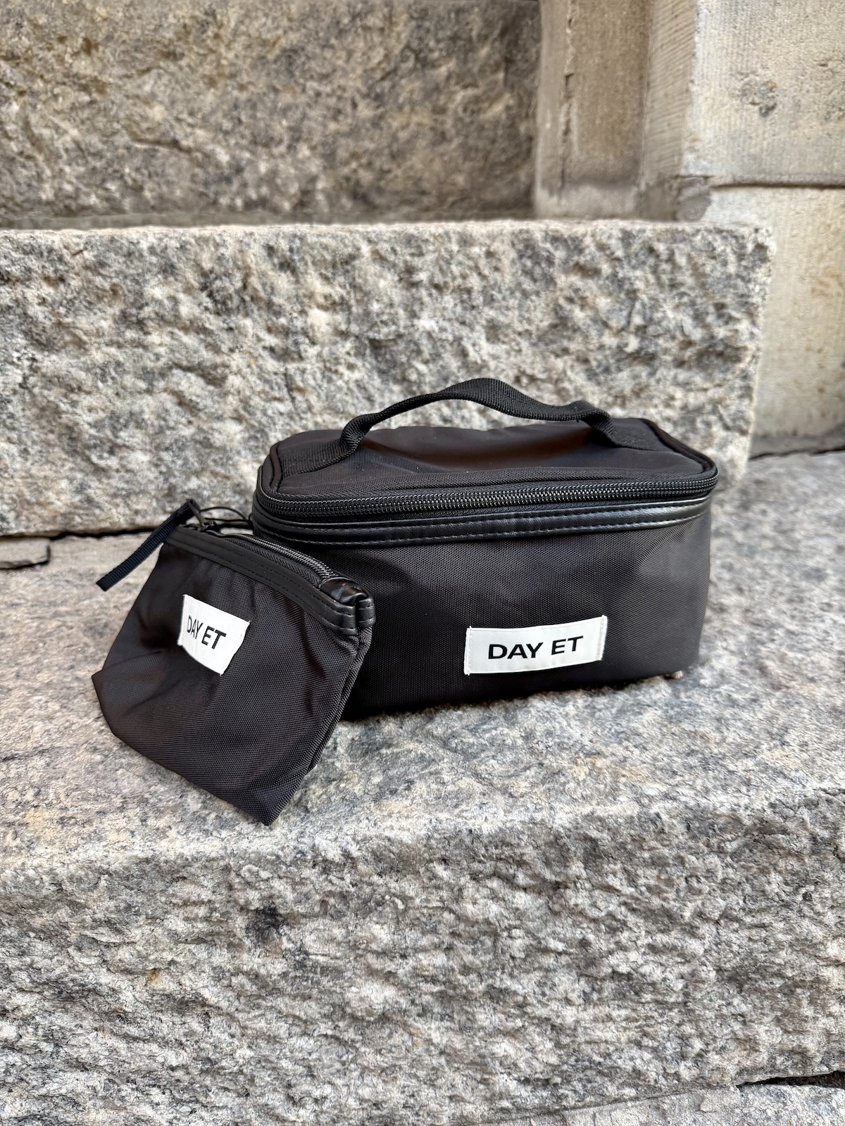 Dayn kosmetiikkasettiin kuuluu pieni pussukka vetoketjulla sekä isompi kosmetiikkalaukku vetoketjulla. Laukussa on musta vuori ja sen sen sisällä on kuminauha pidikkeet sekä kannessa on verkkotasku. Kosmetiikkalaukun koko on 10 x 20 cm.