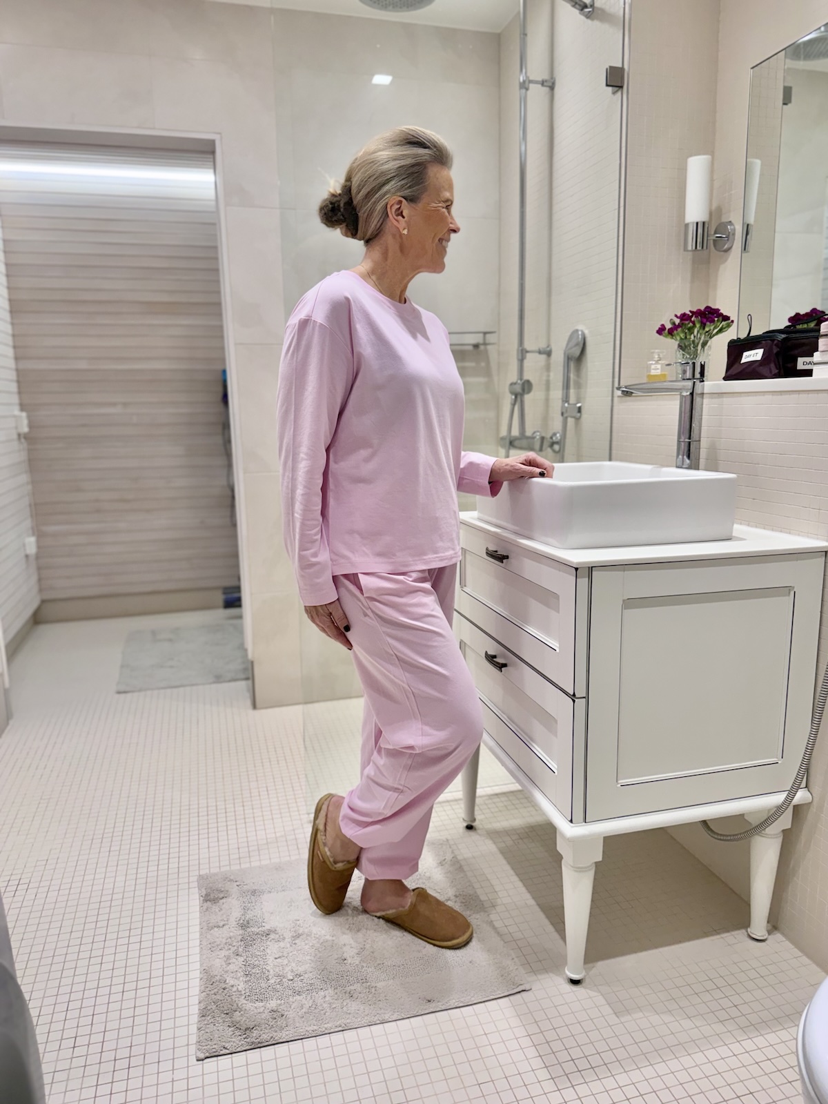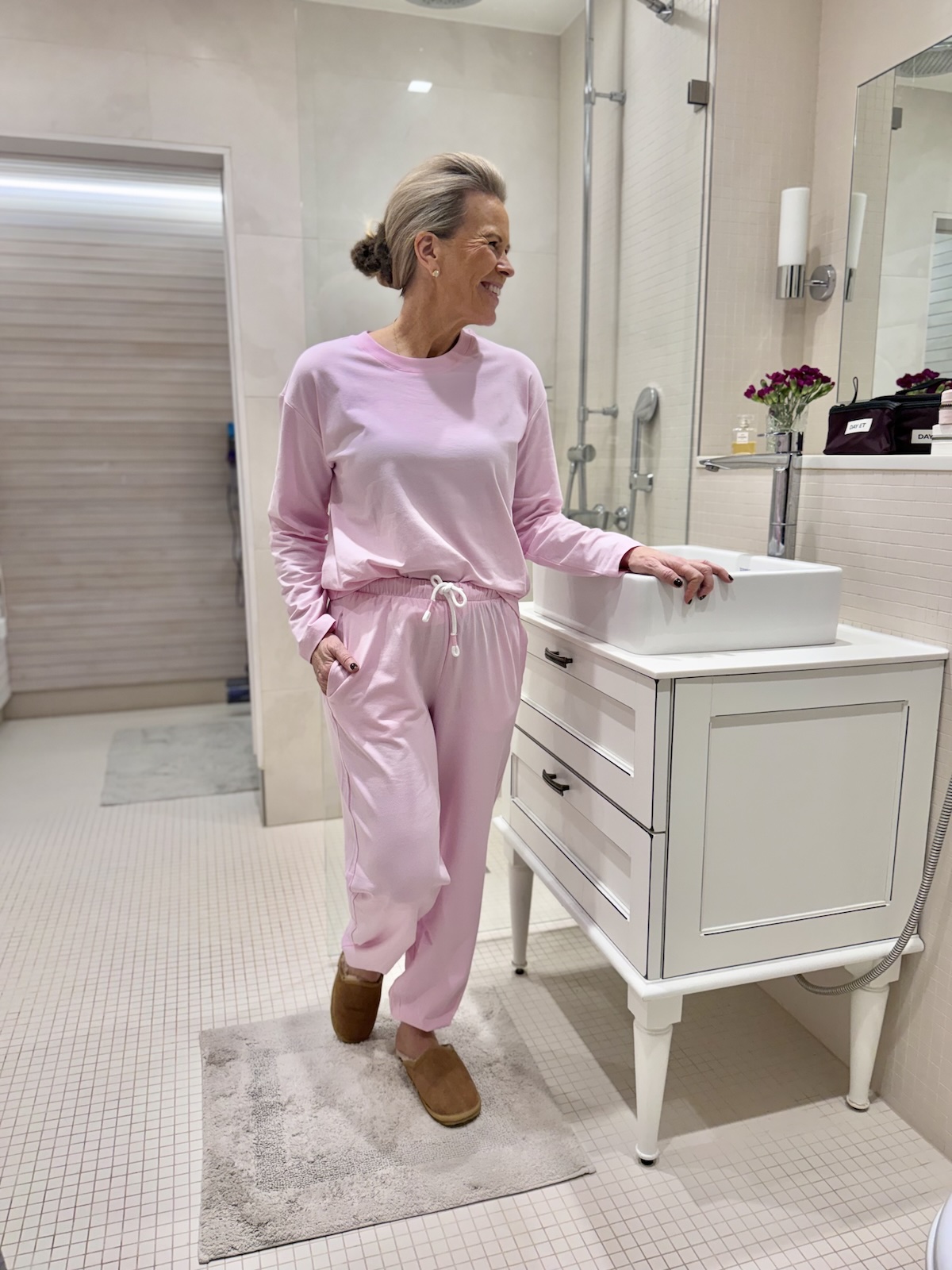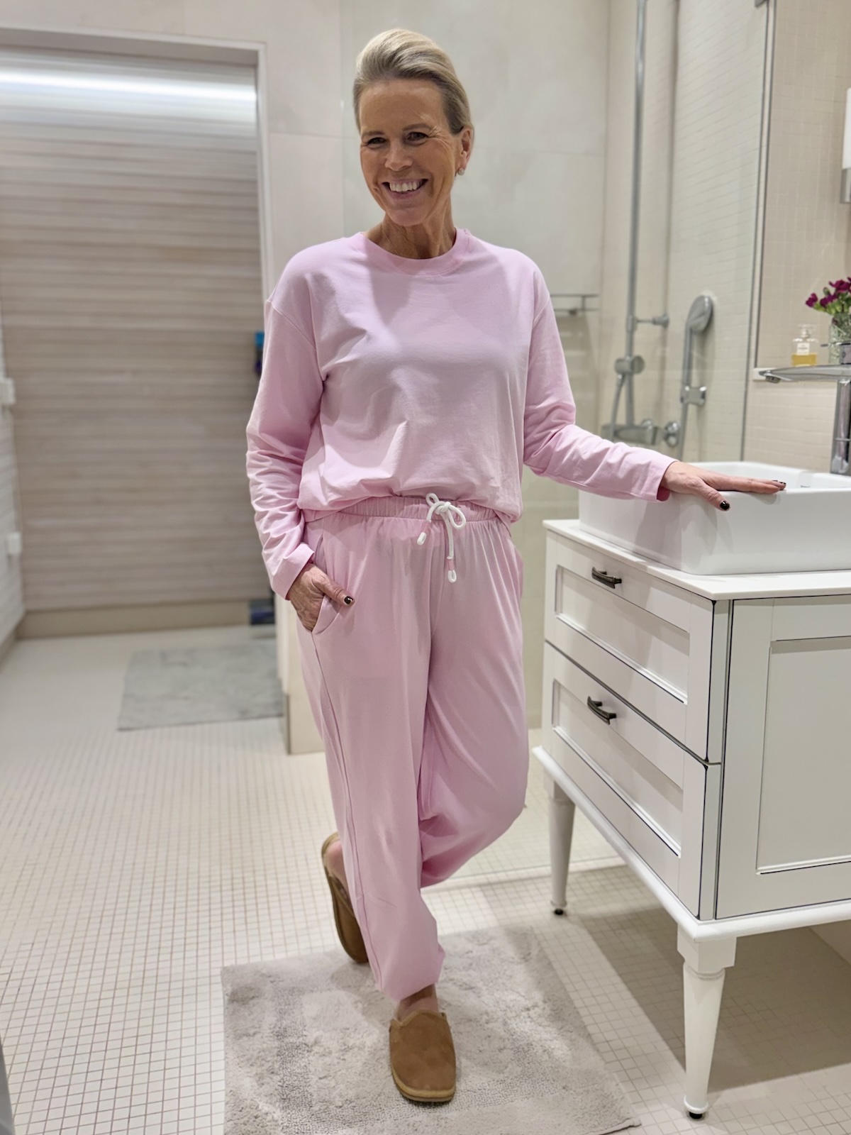 Pyjama on puuvillaa, jossa on muutama prosentti stretchiä mukana. Pyjamaan kuuluu pitkähihainen ja laatikkomainen paita. Housut ovat myös täyspitkät ja nilkoissa on resorit. Vyötäröllä on kuminauha sekä nyörikuja. Housuissa on taskut. Katalla on pyjamasta päällä koko XS. Pyjama on reilua kokoa, mutta niin pyjama saakin olla.