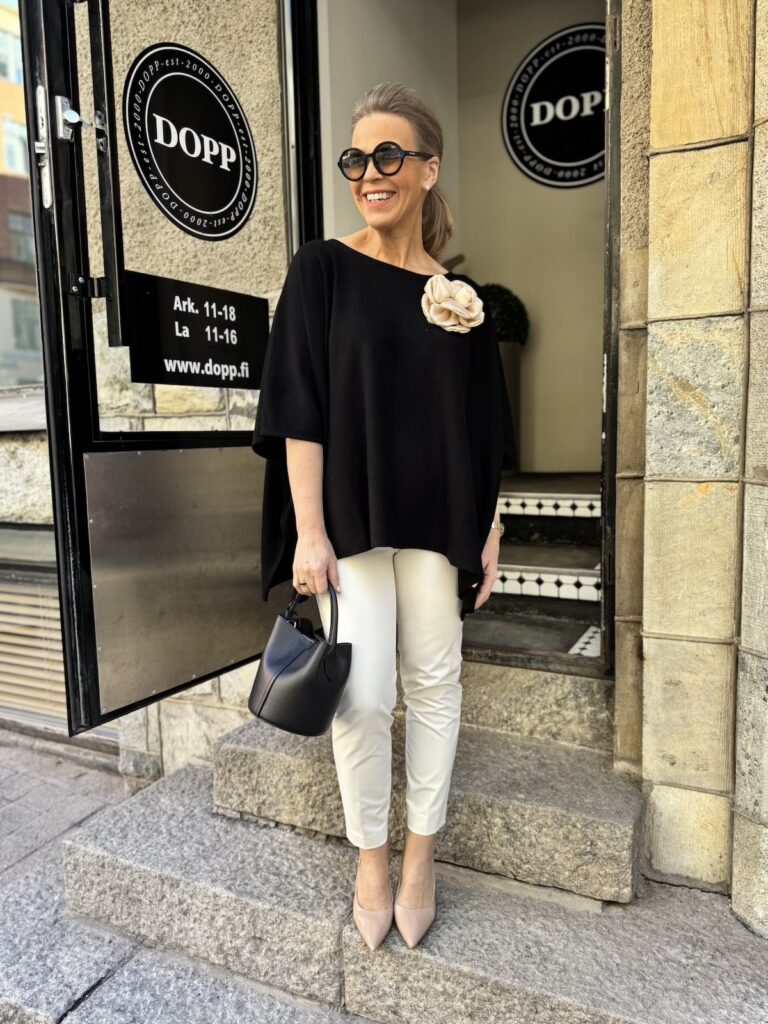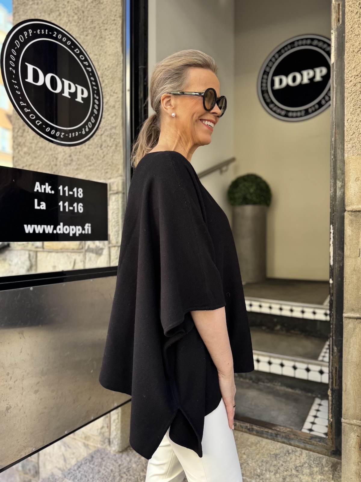 Tilanna on loistava keeppineule. Neuleessa on O-kaula-aukko ja malliltaan se on suorakaiteen muotoinen ja sivussa on käsien aukot ja helmassa pienet halkiot. Neule ylettyy haarasauman kohdalle, sen pituus on 60 cm. Neule toimii moneen erilaiseen tarkoitukseen ja se on kiva myös mekkojen päällä. Keeppineule on yhtä kokoa.