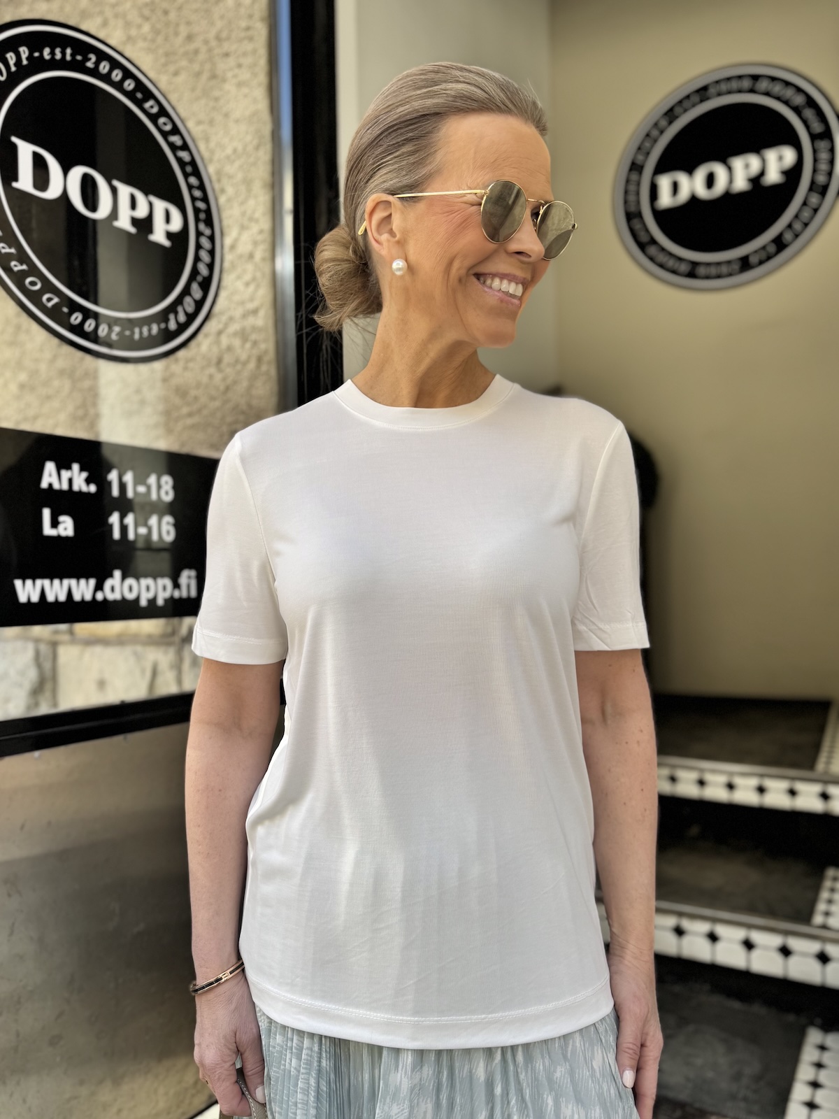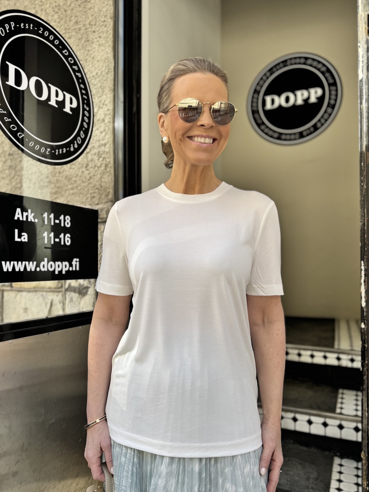 Columbine T-paita on ihanan tuntuista materiaalia ja se on kauniisti laskeutuva. Materiaali on kuin sileää samettia. T-paidassa on O-kaula-aukko ja lyhkäiset hihat. Mallliltaan se on suora ja loppuu noin haarasauman kohdalle. Katalla on T-paidasta päällä koko S.