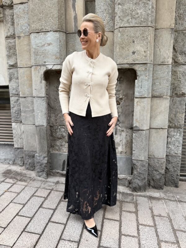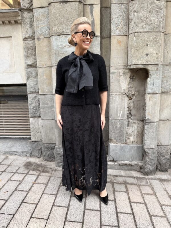 Valentina neuletakki sifonkirusetilla; musta