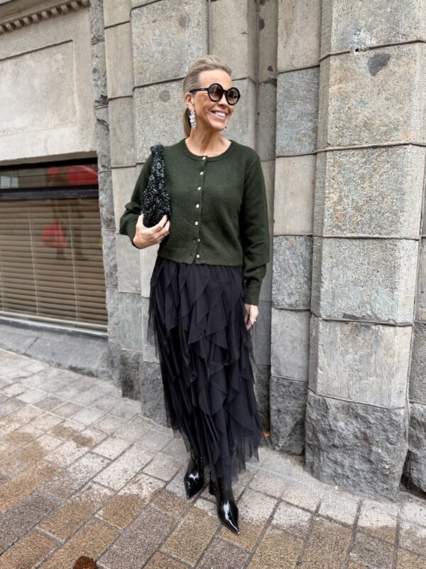 Harietta polvimittainen frillamekko; musta€ 79,95